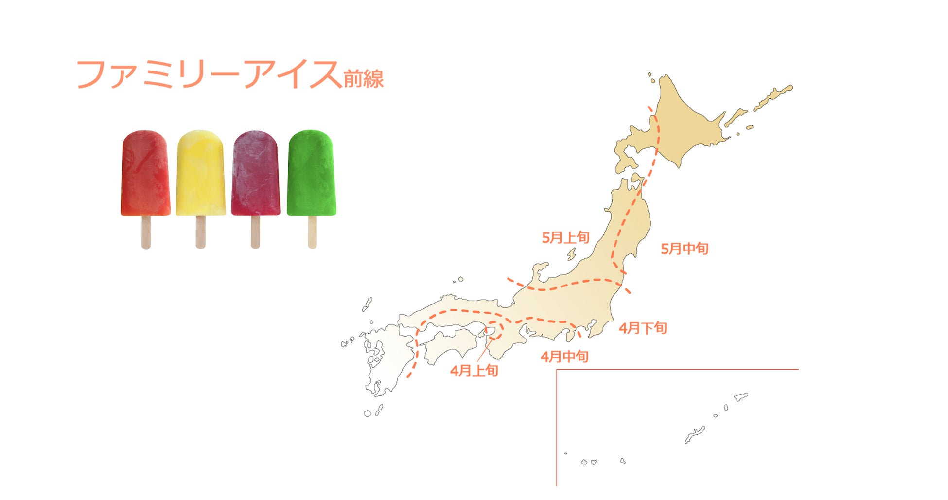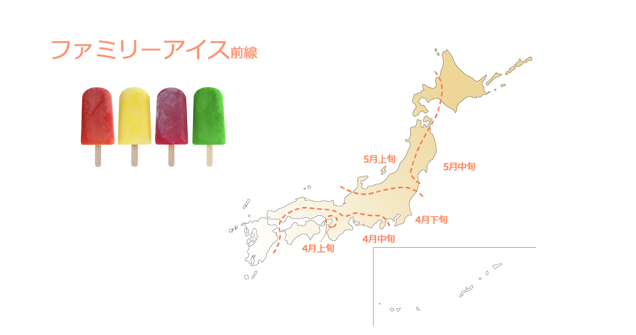 近畿地方の一部、特に周辺地域と比べ気温が高い大阪や神戸などの大都市部は、4月上旬に前線がスタートします。気象台所在地の中で夏の平均気温が最も高い大阪は、夏の季節商品に対する需要の伸びが全体的に早いのかもしれません。その後、四国や東海地方に向けて前線が北上し、九州、関東はやや遅れて4月下旬に到達。そして北日本は「コーラ前線」と同様に、日本海側は5月上旬、太平洋側では少し遅れて5月中旬に前線が到達すると予想されます。昨年は4月、5月とも、おおむね平年並の気温だったのに対して今年はやや高めと予想されているため、昨年と比べ前線到達はやや早くなると考えられます。