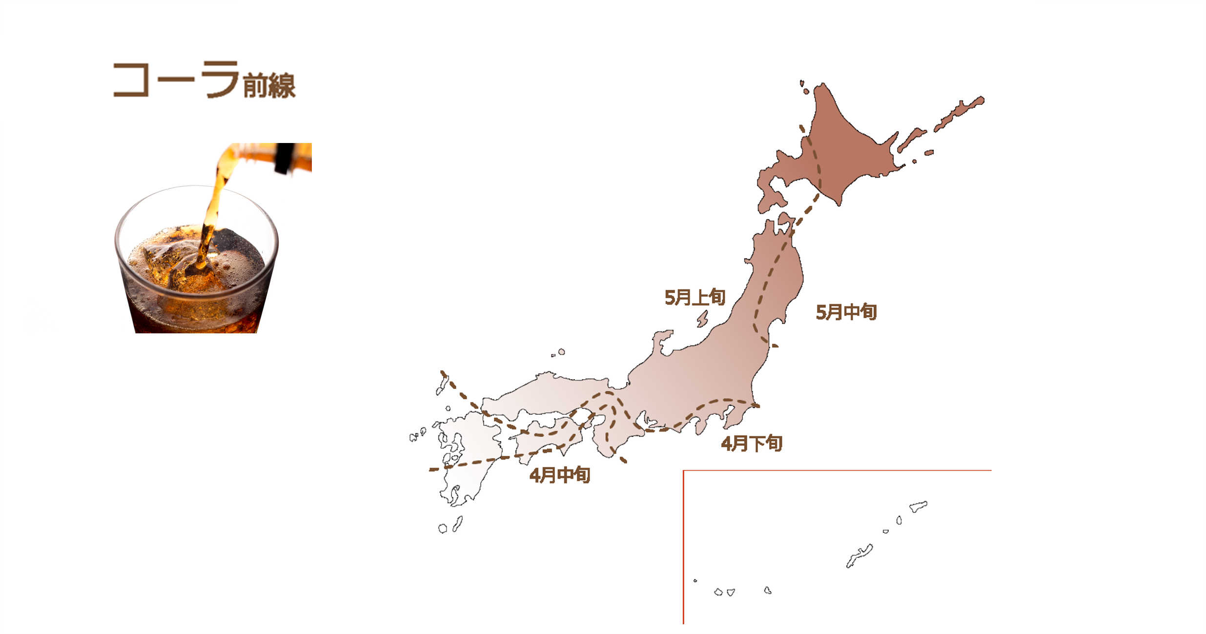 前線は、夏場の平均気温が最も高い九州南部と、近畿地方の一部へ4月中旬に到達します。その後4月下旬から5月上旬にかけて一気に日本列島を北上します。北日本では、前線は太平洋側より日本海側にやや早く到達します。北日本の日本海側は冬の間、雪に閉ざされる期間が長いため、「いち早く春の訪れを感じたい」という気持ちからか、気温上昇とともに飲みたくなるコーラや行楽用品の需要の伸びが同太平洋側と比べて少し早いのかもしれません。長期予報によるとこの期間、全国的に気温が平年よりやや高めと予想されており、前線到達は例年に比べるとやや早めです。