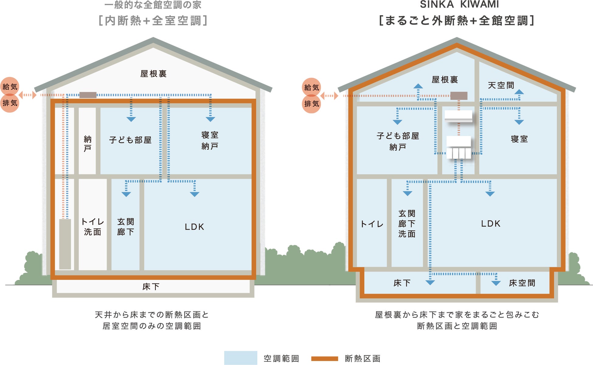 まるごと外断熱と相性のいい「全館空調システム」を採用し、屋根裏から床下まで断熱して空気を循環。家庭用エアコン1台で家中をくまなく空調するため、常に室内温度を一定に保つことによりいつでも、どこでも快適に過ごせます。