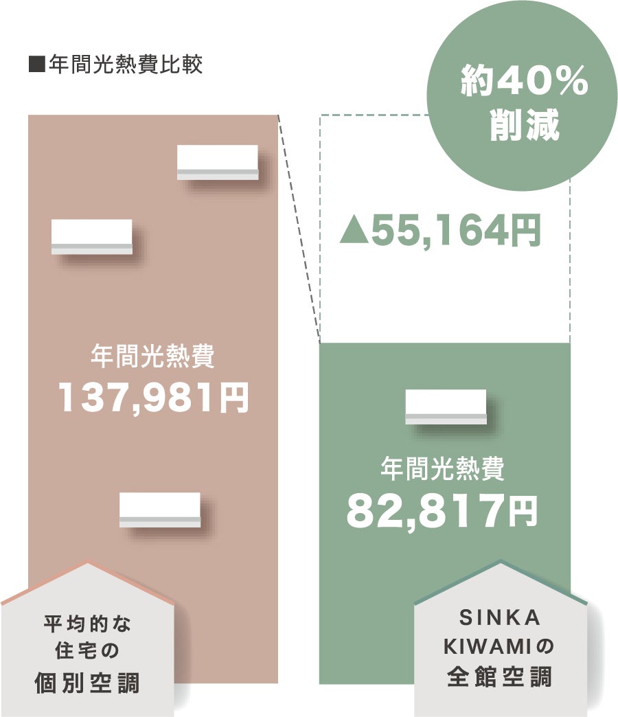 (4)年間光熱費は一年中全館空調しているにも関わらず、平均的な住宅の個別空調との比較で約40%削減※4