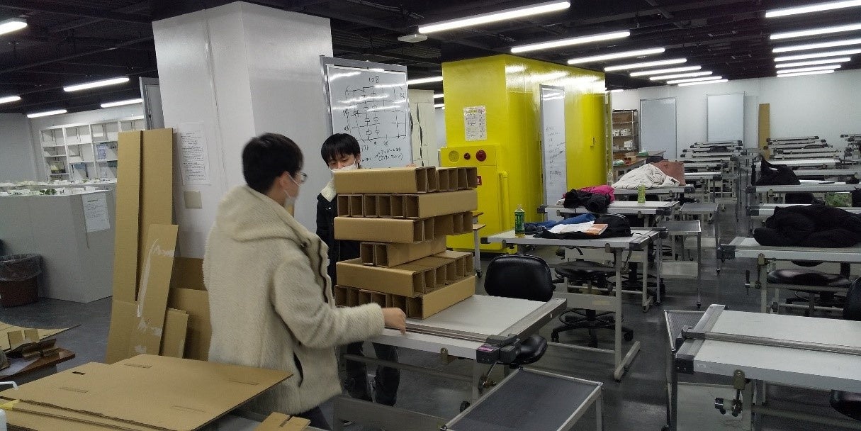 大谷教授のゼミでは、本学が位置する寝屋川市の駅前広場の一角にほとんど活用されていない空間があることに着目。観察調査から若年層やファミリー層の通行が少ないことが分かりました。そこで、段ボールで作った小型の家(床は1.7m×1.7m)やクリスマスツリー、子供が体を使って楽しめるゲームを設けたイベントを企画しました。SDGsの実現にも貢献できるよう、使用する材料は廃棄予定のペットボトルや学科の展示で使用した段ボールを再利用します。クリスマスが近いことから、段ボールのツリーやイルミネーションなどの明かりもつけ、日ごろ通行している住民に新たな空間活用の可能性に気づいてもらいます。