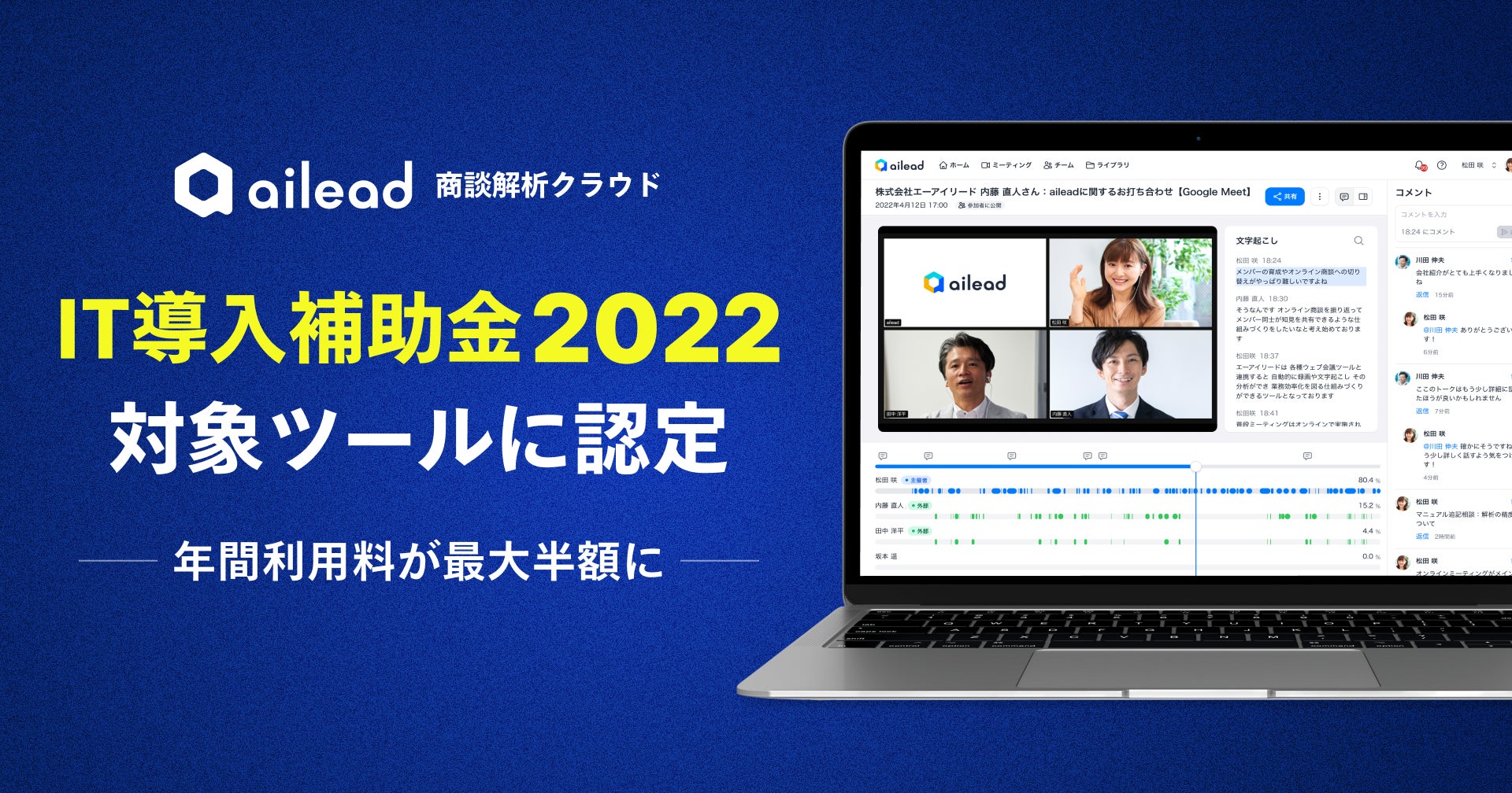 株式会社ailead(本社:東京都港区、代表取締役:杉山大幹、以下ailead)は、経済産業省が推進する「 IT 導入補助金2022」において、 IT 導入支援事業者として採択されました。これにより、当社の商談解析クラウド ailead(エーアイリード)が補助金対象ツールとして認定され、導入時に通常料金の最大半額の利用料で ailead をご利用いただけます。