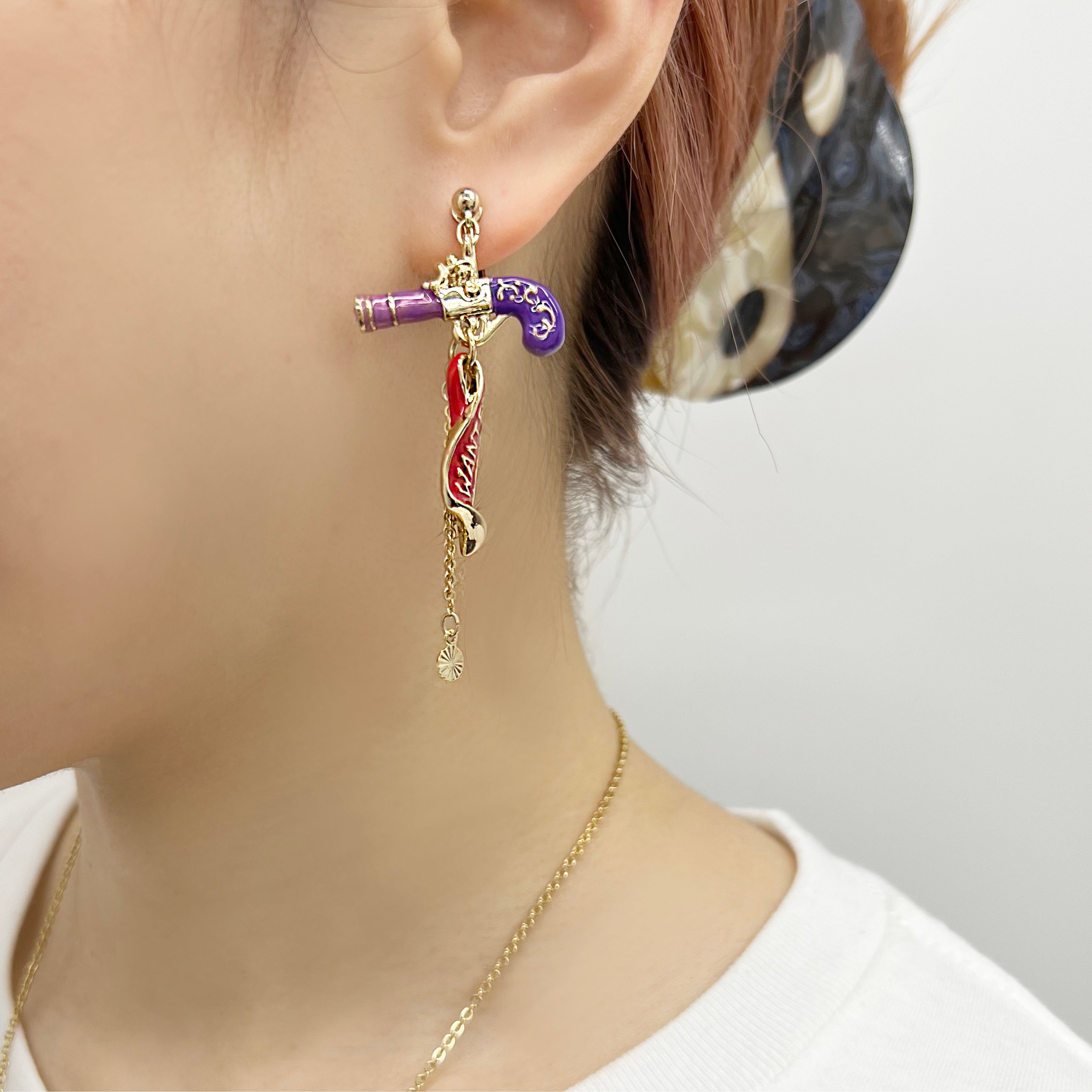 海賊が持っている拳銃をイメージしたイヤーアイテムは、銃口に紫のカットガラスが埋め込まれているのもこだわりポイントです。