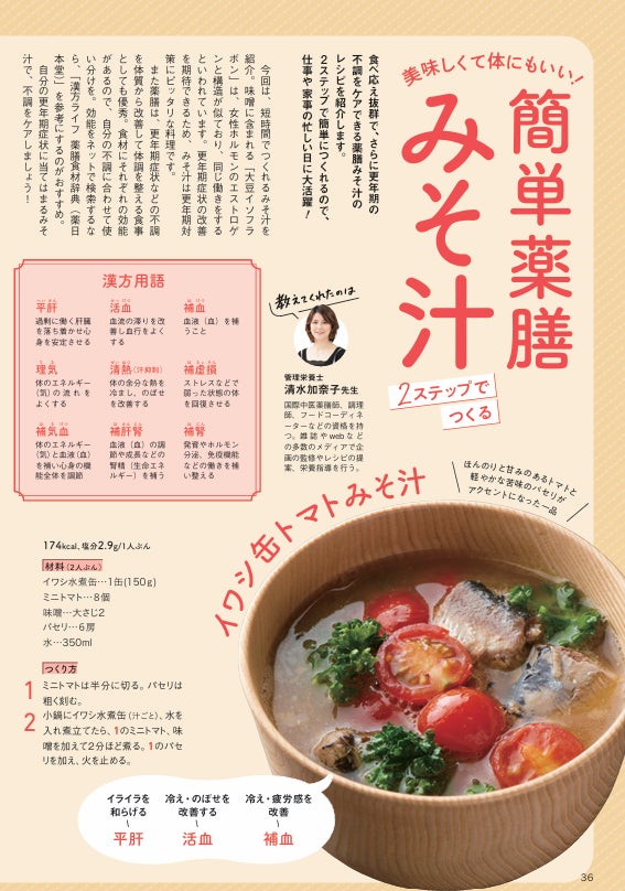 食べごたえ抜群で、さらに更年期の不調をケアできる薬膳みそ汁をご紹介。みそには、女性ホルモンに似た働きをすると言われている、大豆イソフラボンが含まれています。漢方の観点から、期待できる効果も掲載しているので、ご自身の更年期症状に合わせたみそ汁をつくることができます。
