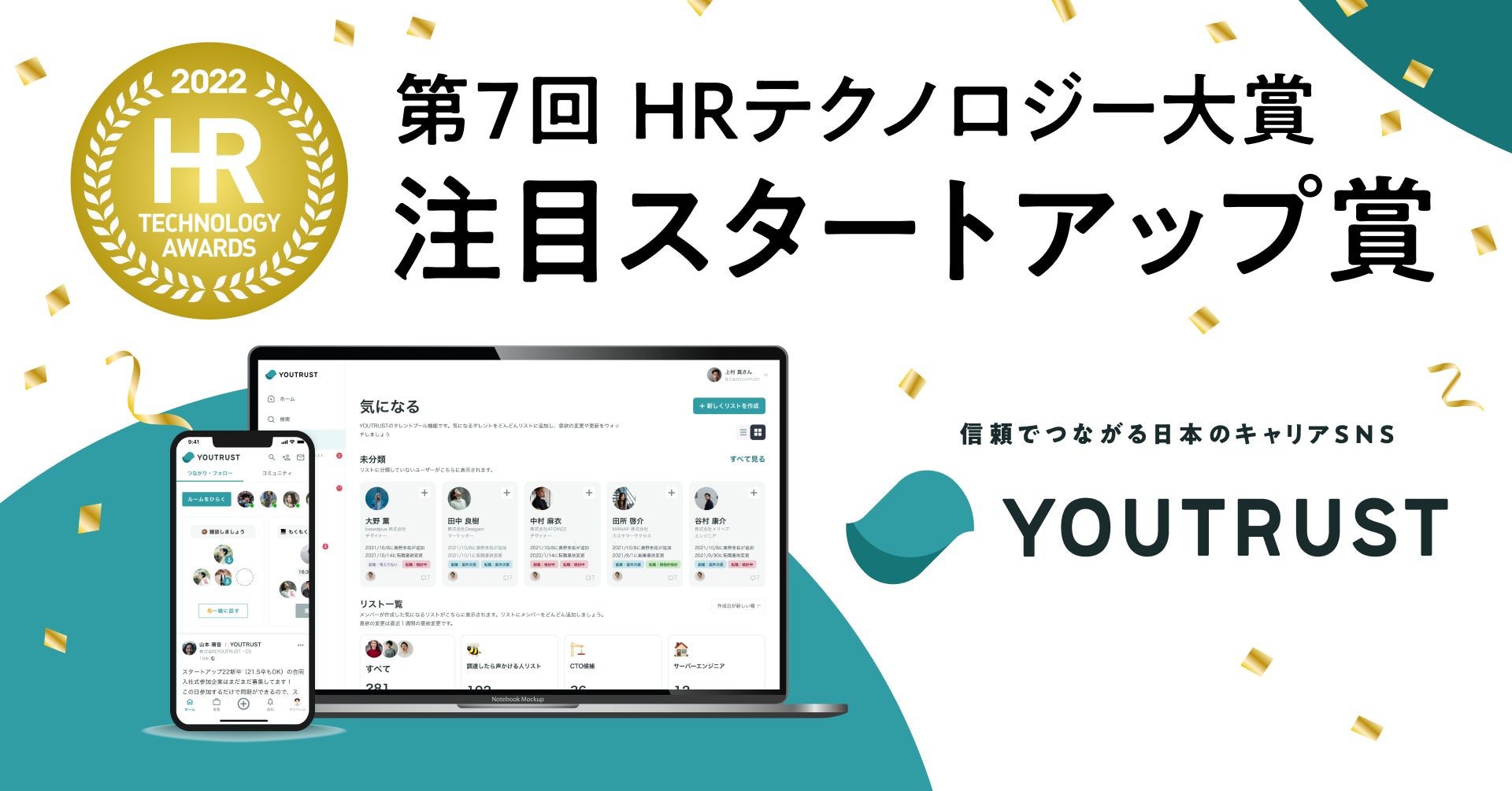 キャリアSNSおよびHR Tech SaaS「YOUTRUST」を提供する株式会社YOUTRUST(本社:東京都渋谷区、代表取締役CEO:岩崎由夏)が、「第7回 HRテクノロジー大賞」(後援:経済産業省、産業技術総合研究所、情報処理推進機構、中小企業基盤整備機構、株式会社東洋経済新報社、株式会社ビジネスパブリッシング、HRテクノロジーコンソーシアム、HR総研(ProFuture株式会社))において、「注目のスタートアップ賞」を受賞しましたので、お知らせいたします。