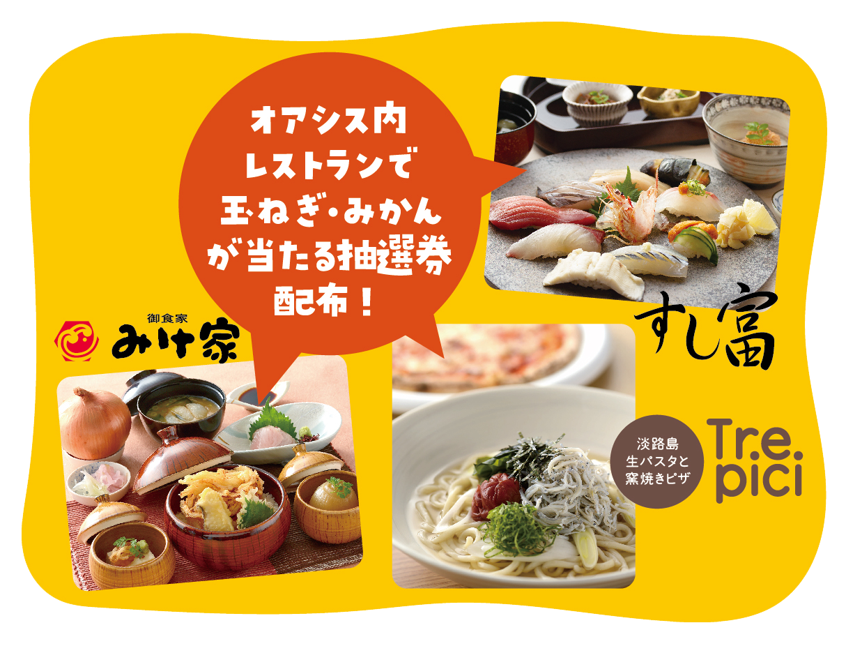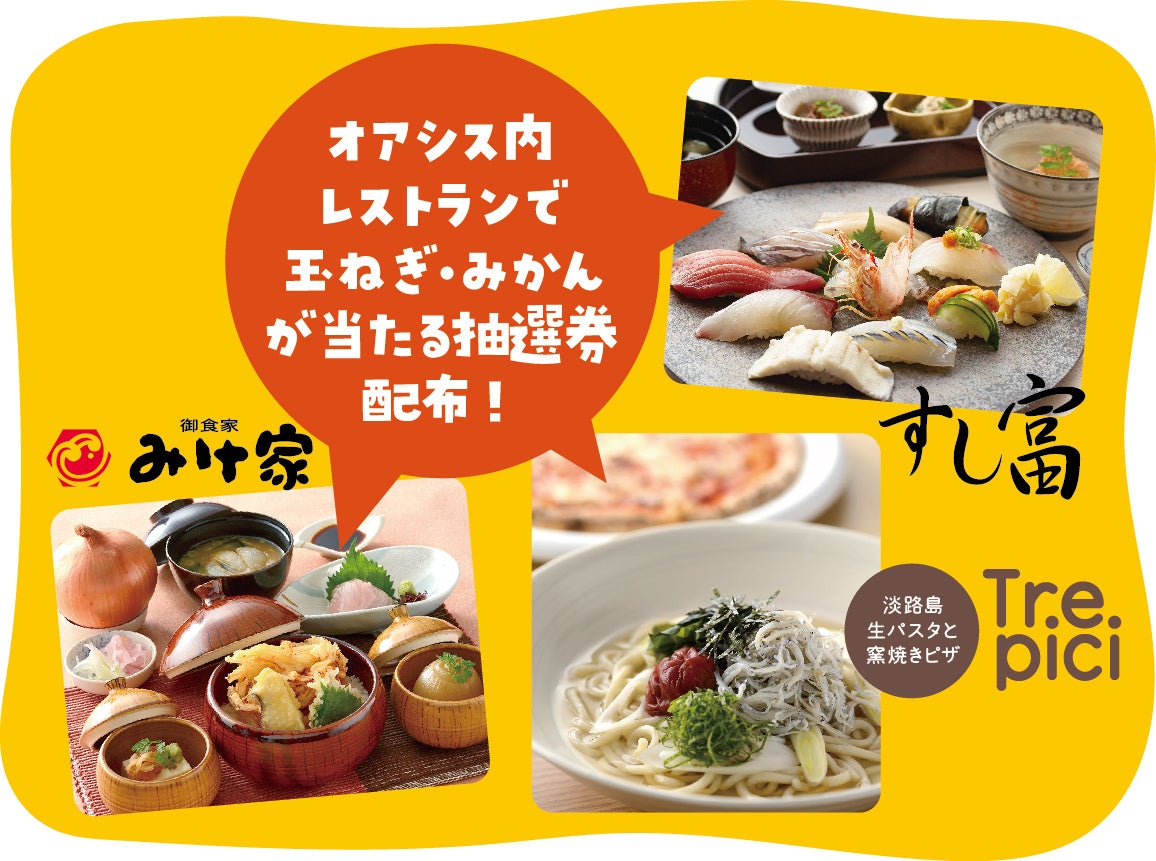 期間中、淡路ハイウェイオアシス内レストラン(みけ家、すし富、Trepici)利用で、淡路島産玉ねぎ・みかんが当たる抽選券を配布いたします。
