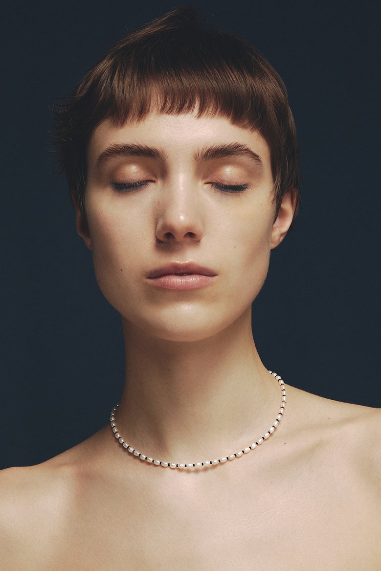 シャープで美しい佇まいの淡水パールを連ねたチョーカー。