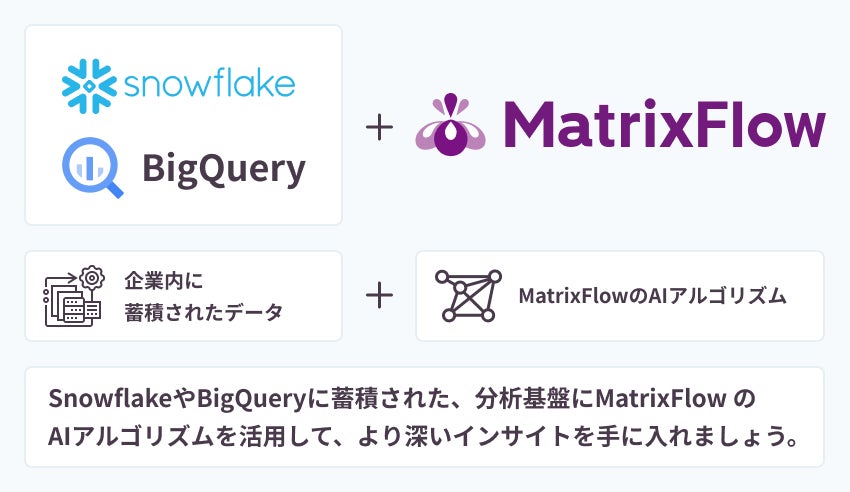 SnowflakeとBigQueryの強力なデータウェアハウス機能にアクセスし、MatrixFlowの高度なAIアルゴリズムを活用することで、より深いビジネスインサイトを得ることができます。