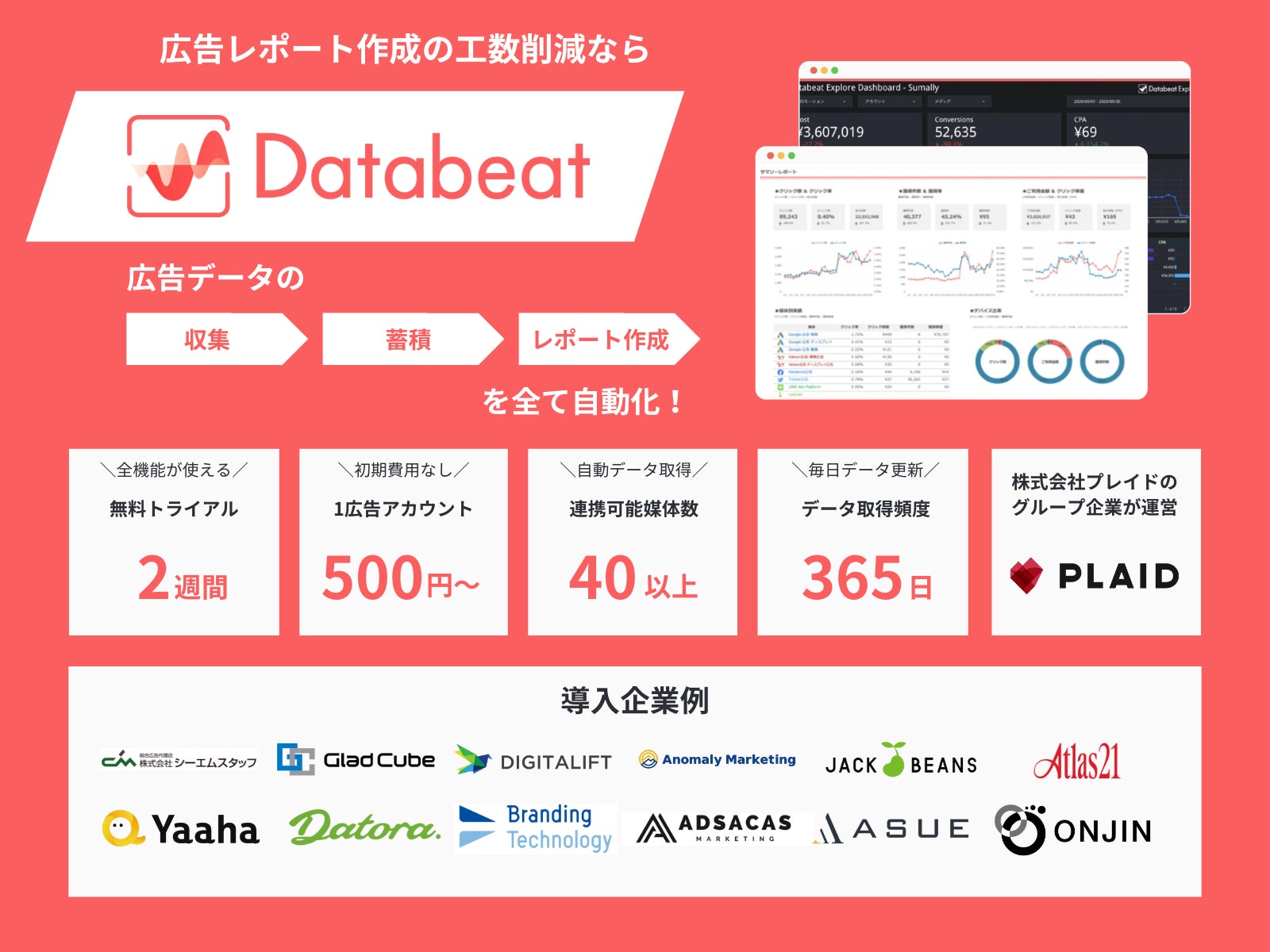 アジト株式会社が開発・提供する広告レポート自動化ツール「Databeat」は、合計40以上の広告媒体や計測ツールと連携してデータの収集から蓄積、レポート作成を自動化できます。