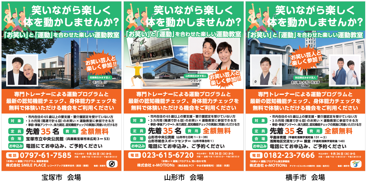 本事業ではe-MOTIONsが、47都道府県に地域に根差した「住みます芸人」を配置する吉本興業株式会社(所在地:大阪府大阪市)や、事業実施エリアでデイサービス事業等を展開する株式会社Smile Place(所在地:兵庫県西宮市)と連携し、複数拠点での同フォーマットのプログラム提供を通じ、「笑い」と「運動」の相互作⽤がもたらす⾝体機能、認知機能の維持・向上効果の検証を実施し、一般生活者のフレイル予防に対する関心、行動変容意欲、満足度に関する調査をおこないます。