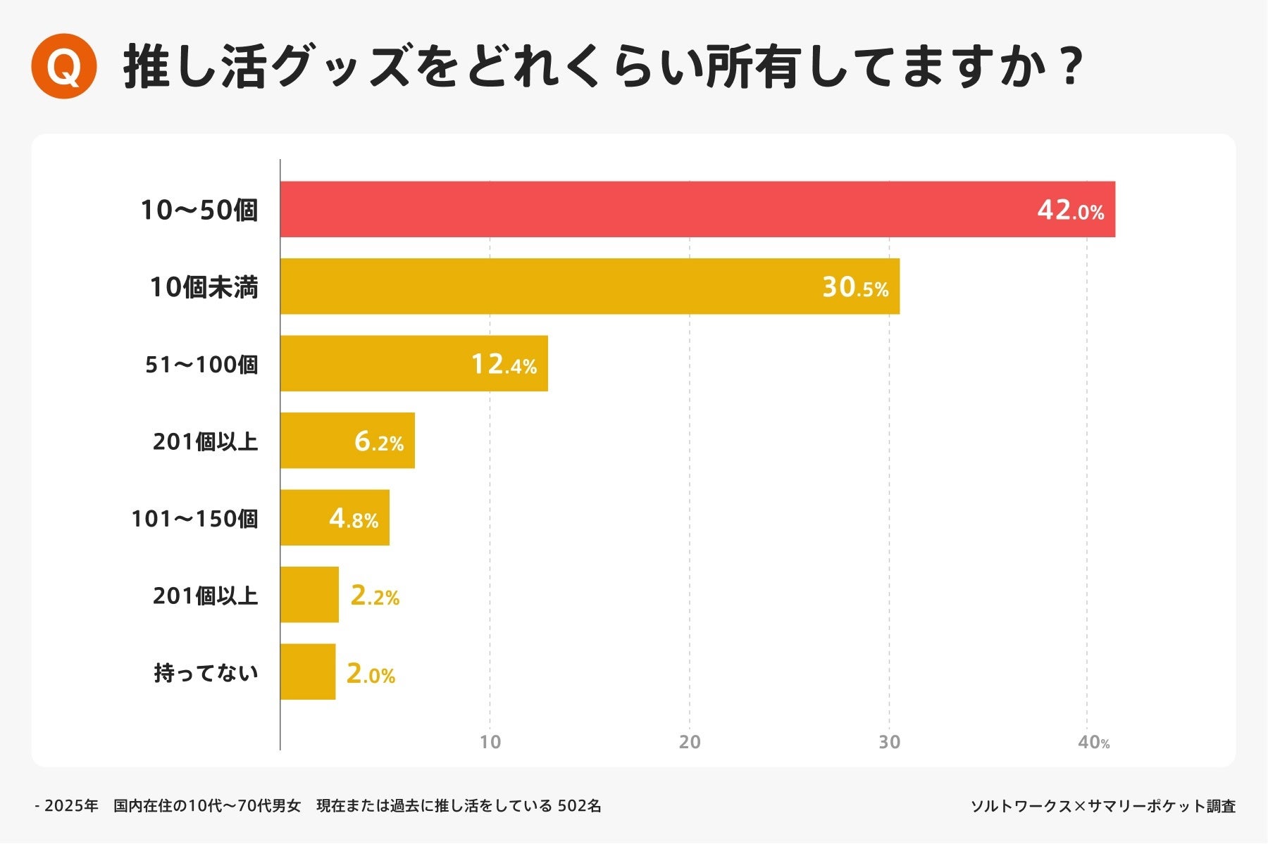 一方で、公式グッズの収集も依然として活発です。推しグッズの所有数を見ると、42.0%が「10~50点」で最も多く、100点以上を保有する熱心なコレクター(13.2%)も存在します。