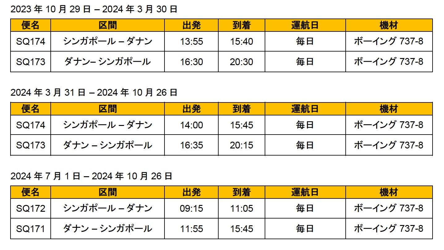 シンガポール – ダナン間(SQ174便、SQ173便)は2023年10月29日より週3便からデイリー運航に増便します。2024年7月1日からSQ172便、SQ171便は週4便からデイリー運航となる予定です。これにより両都市間の運航は、パンデミック前と同水準の週14便になる予定です。同路線は、ボーイング737-8型機で運航します。