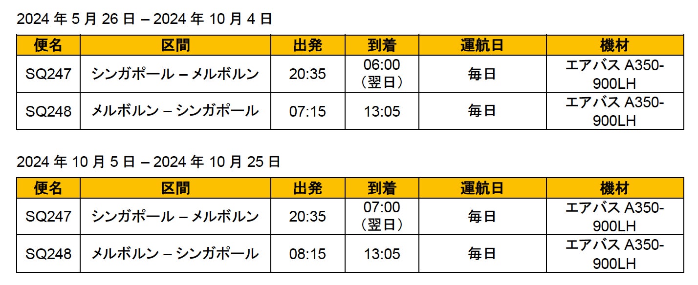 シンガポール – メルボルン間(SQ247便、SQ248便)では、2024年5月26日よりエアバスA350-900長距離(A350-900LH)型機で5便目のデイリー運航を追加します。この増便より、現在の毎日4便運航から、パンデミック前と同じ毎日5便の運航になる予定です。
