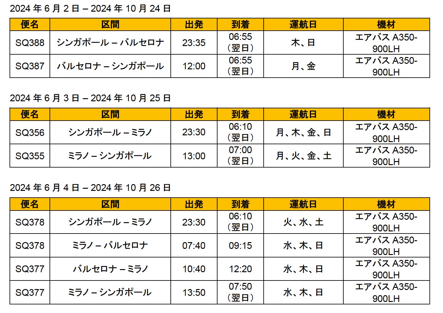 2024年6月2日からシンガポール – バルセロナ間(SQ388便、SQ387便)の直行便を再開し、週2便運航します。またシンガポール – ミラノ間(SQ356便、SQ355便)の直行便は週2便から週4便に増便します。以遠権フライトであるシンガポール – ミラノ – バルセロナ路線のSQ378便、SQ377便は週5便から週3便の運航になる予定です。