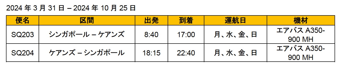 シンガポール – ケアンズ間は現在SQ203便とSQ204便で週5便運航しています。2024年3月31日より、機材をナローボディのボーイング737-8型機から同路線では20年以上ぶりとなるワイドボディ機で従来より大きな機材のエアバスA350-900 中距離(A350-900MH)型機に変更し週4便を運航します。