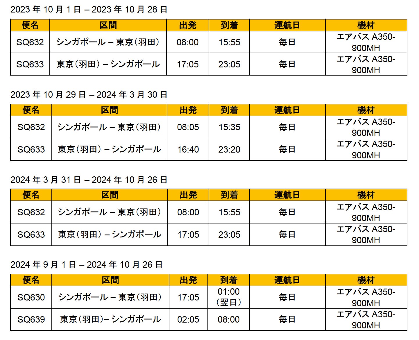 2023年10月1日より、シンガポール – 東京(羽田)間(SQ632便、SQ633便)は、3便目となるデイリー運航便を追加します。2024年9月1日からは、シンガポール – 東京(羽田)間で、デイリー運航便で4便目(SQ630便、SQ639便)となる運航を開始します。どちらの運航もエアバスA350-900中距離(A350-900MH)型機が投入される予定です。これにより、シンガポール – 東京(羽田)間は、現在毎日2便の運航からパンデミック前と同じ毎日4便の運航へと戻ります。