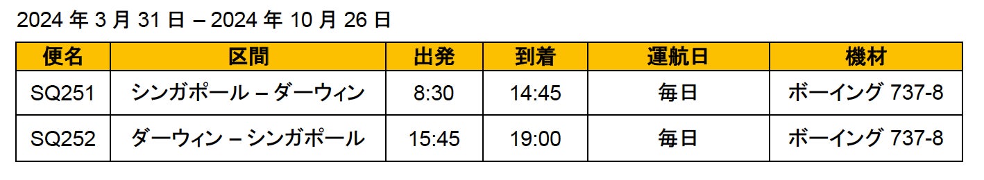 シンガポール – ダーウィン間(SQ251便、SQ252便)は、現在週5便を運航していますが、2024年3月31日より毎日運航します。これによりパンデミック前と同じ運航頻度になる予定です。