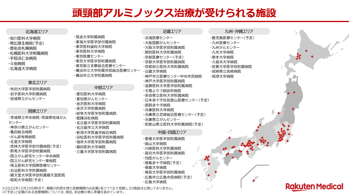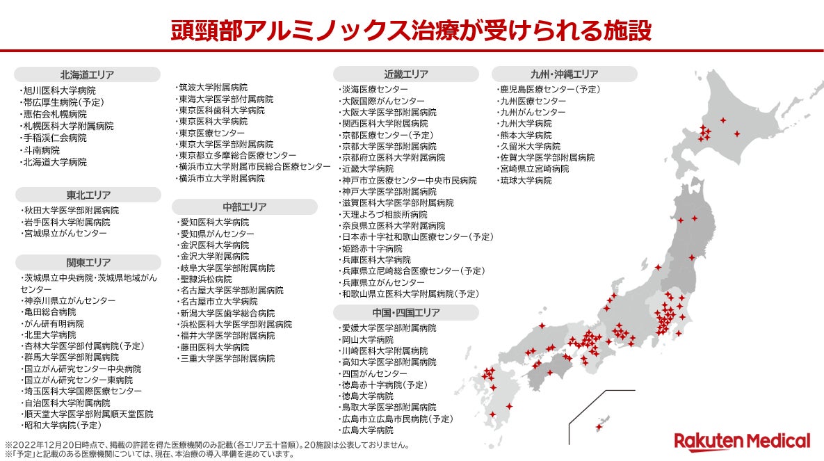楽天メディカル株式会社(本社:東京都世田谷区、代表取締役会長:三木谷 浩史/以下、楽天メディカル)は、同社が製造販売を行う医薬品「アキャルックス®点滴静注250㎎」(一般名:セツキシマブ サロタロカンナトリウム(遺伝子組換え)/以下、本医薬品)および医療機器レーザ装置「BioBlade®レーザシステム」(以下、本医療機器)を用いた、頭頸部アルミノックス治療(光免疫療法)(以下、本治療)について、来春までに100施設以上で提供可能となることをお知らせします。40都道府県の230名以上の治療医¹⁾よって本治療を提供いただくにあたり、各施設と連携し迅速に導入準備を進めています。
