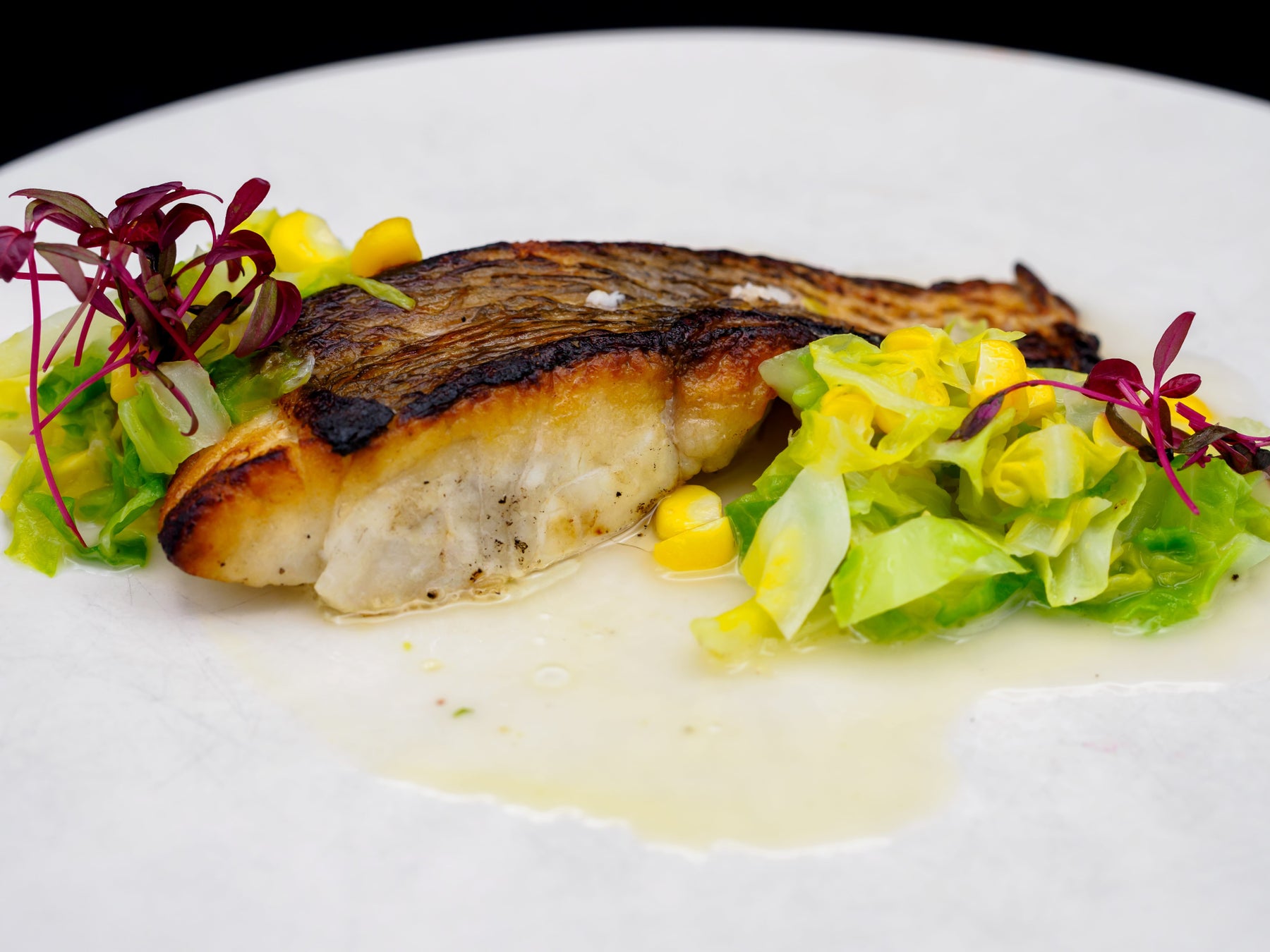 柔らかく、みずみずしい春キャベツをバターでサッと火入れし、とうもろこしと一緒に添えております。