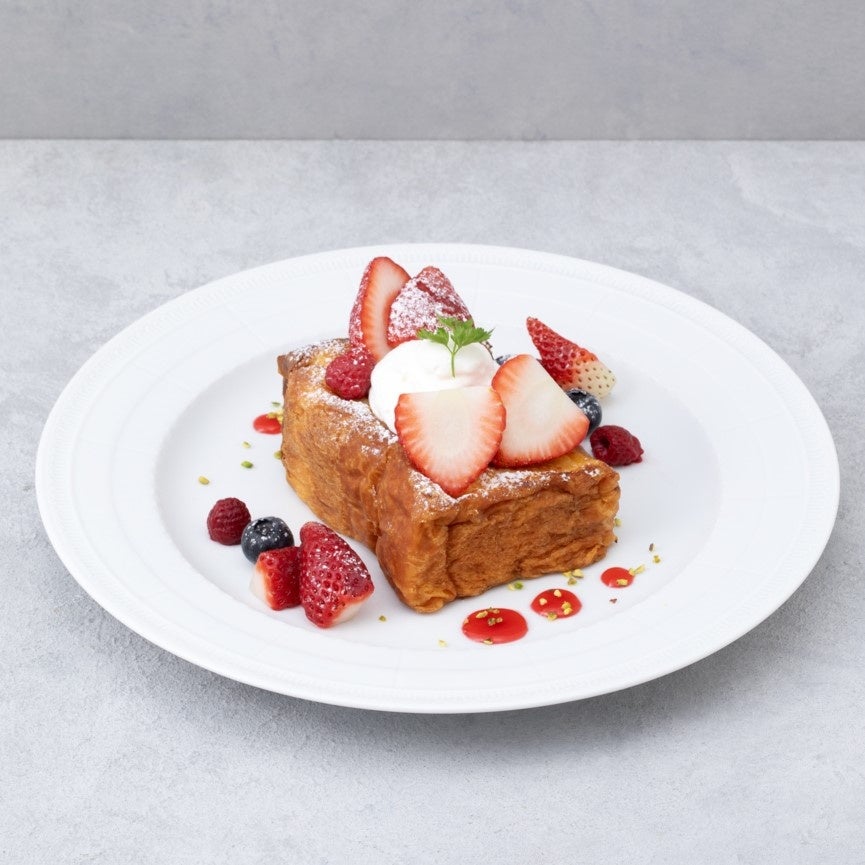 厚切りのブリオッシュを卵液に長時間漬けてから焼きあげ、とちあいか、フランボワーズ、ブルーベリーで彩った“ベリーづくし”のいちごフェア限定フレンチトースト。表面は香ばしく、中はトロふわ食感。別添えのメープルシロップやベリーソースを掛けると美味しさが引き立ちます。