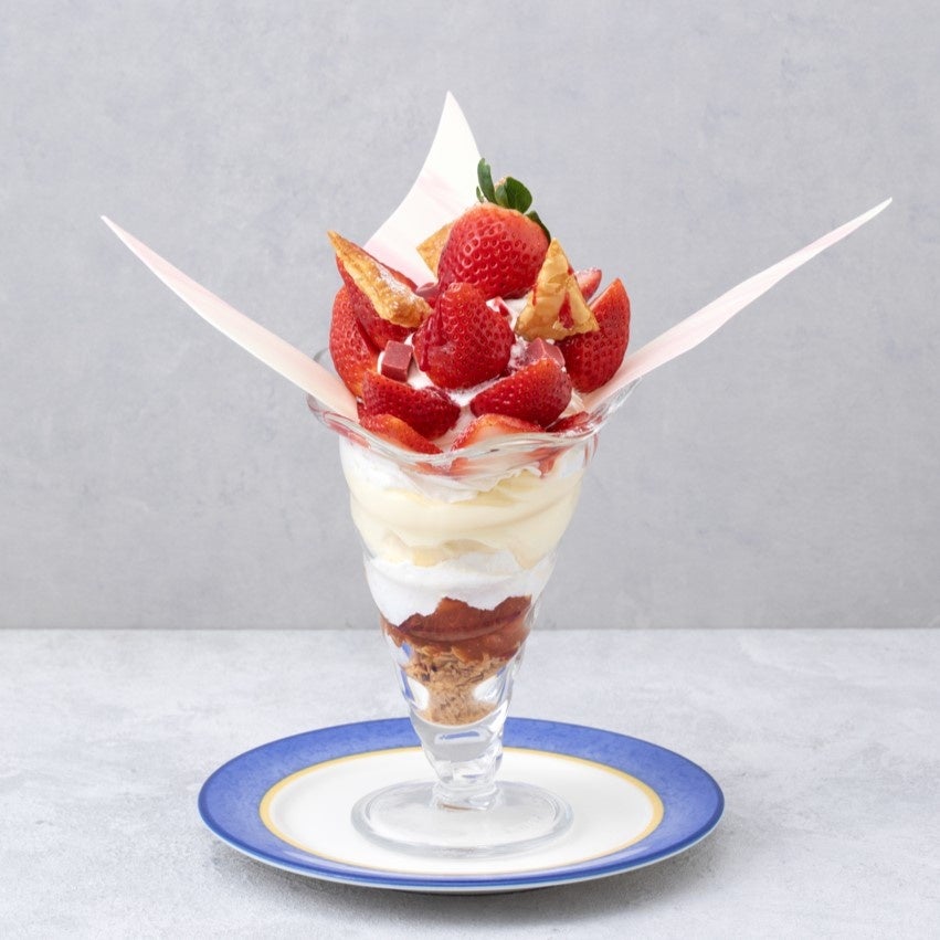 たっぷりのとちあいかの下に、いちごとバニラ2種類のアイス、カスタードクリーム、生クリーム、ベリーのコンフィチュール、クレープ生地を焼いたロイヤルティーヌなどが重なったパフェ。食べ進めるごとに食感や味わいの変化を楽しめる、贅沢な一品です。