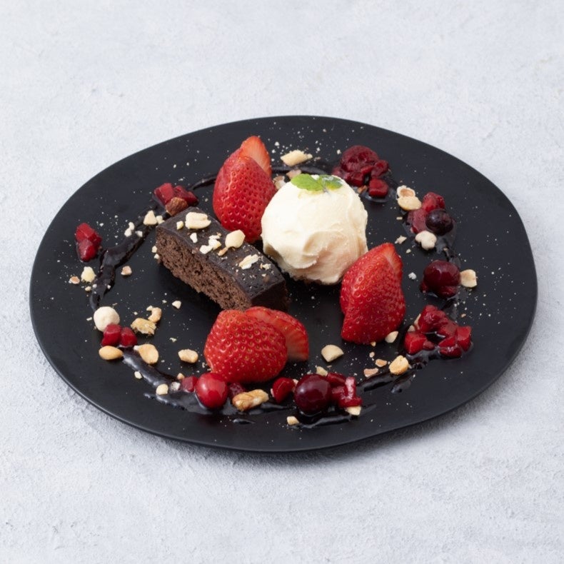 ショコラケーキとバニラアイス、とちあいかをたっぷりのせた贅沢なプレート。しっとり濃厚な味わいのチョコレートとジューシーなとちあいかは相性抜群。コクのあるアイスクリームや、ミックスベリーがごろごろと入ったソースを絡めると絶品です。