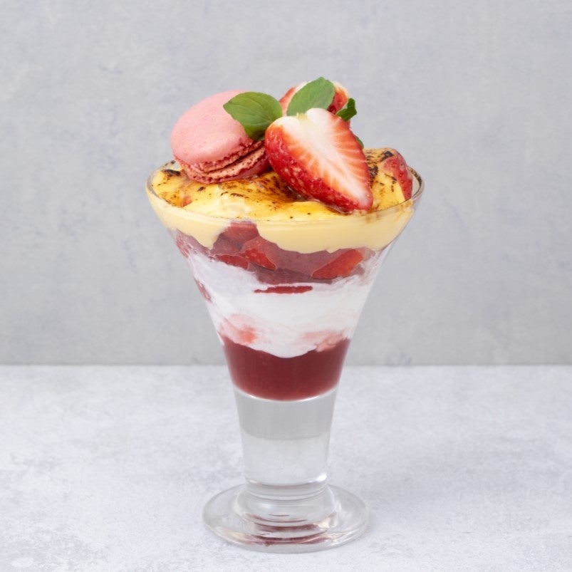 ベリーソース、生クリーム、カスタードブリュレで構成された、すぱじろう特製パフェ。甘みと酸味のバランスが絶妙なとちあいかと、濃厚な生クリーム、カスタードが調和します。トッピングに使用しているいちごのマカロンのサクッとした食感も楽しめます。