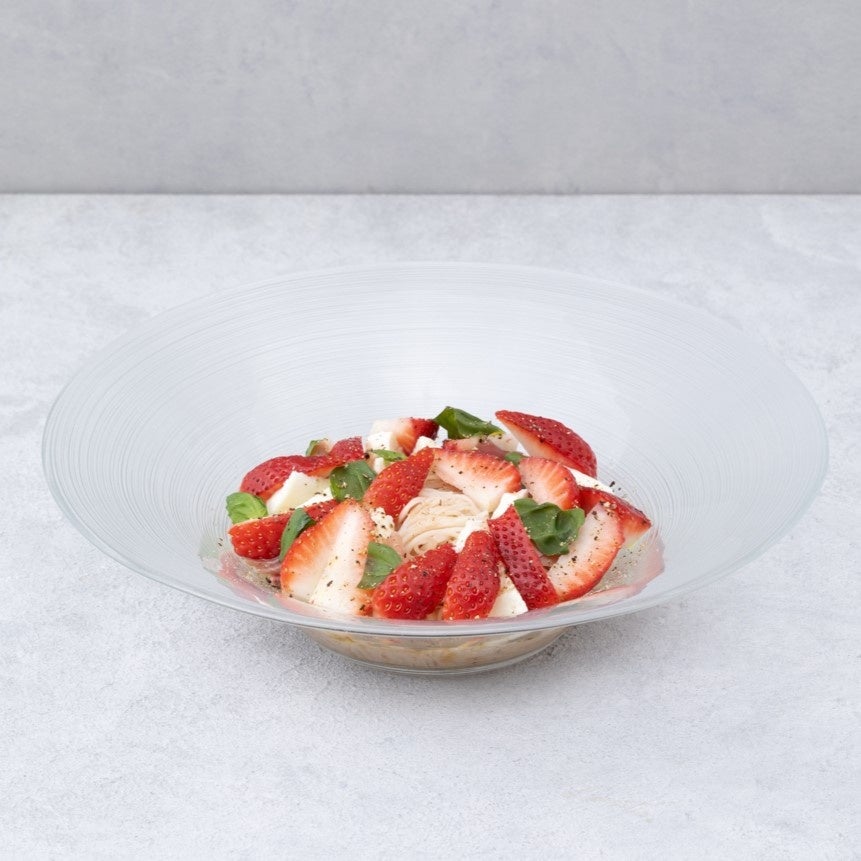いちごのコンフィチュールをベースにオリーブオイルやレモン果汁などで整えたソースを絡めて食べる、新感覚そうめん。モッツァレラチーズと生ハム、とちあいかを贅沢にトッピングした冷製そうめんは、とちあいかのジューシーな甘さと、レモンの酸味やバジルの風味がアクセントとなり大人な味わいです。