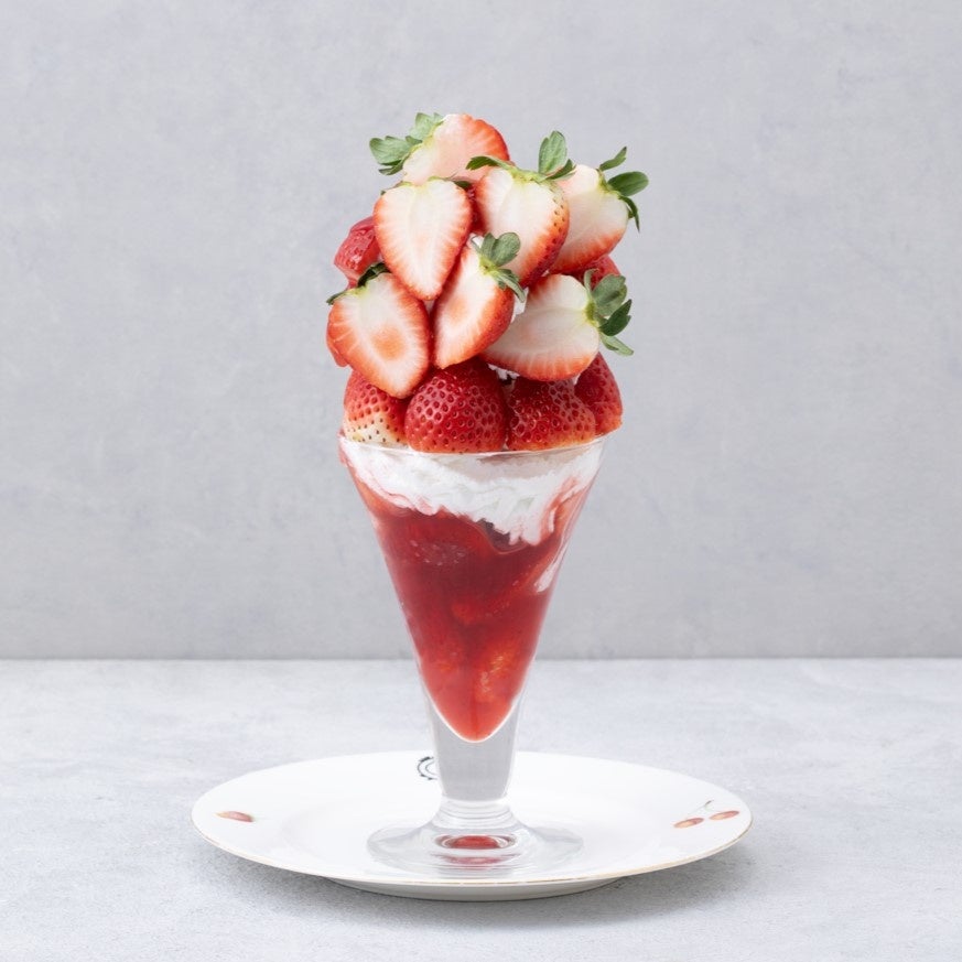 栃木県産の甘くてジューシーなとちあいかをふんだんに使用した贅沢なパフェ。いちごと生クリーム、バニラアイス、ベリーソースのみのシンプルな構成で、とちあいか本来の味を堪能できます。