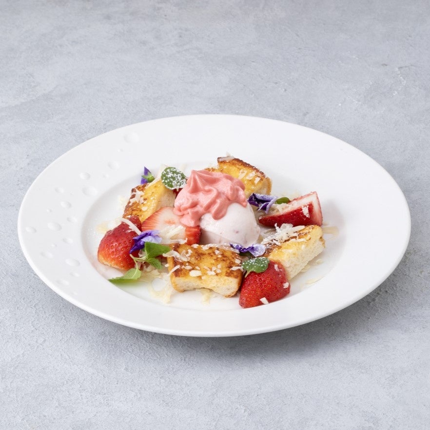 焼きたてのフレンチトーストにとちあいか、はちみつ、マスカルポーネチーズといちごのアイス、いちごのエスプーマ、さらに上からラクレットチーズがトッピングされた贅沢な一皿。口いっぱいに広がるいちごの甘さや香り、2種類のチーズが織りなすうまみをお楽しみいただけます。
