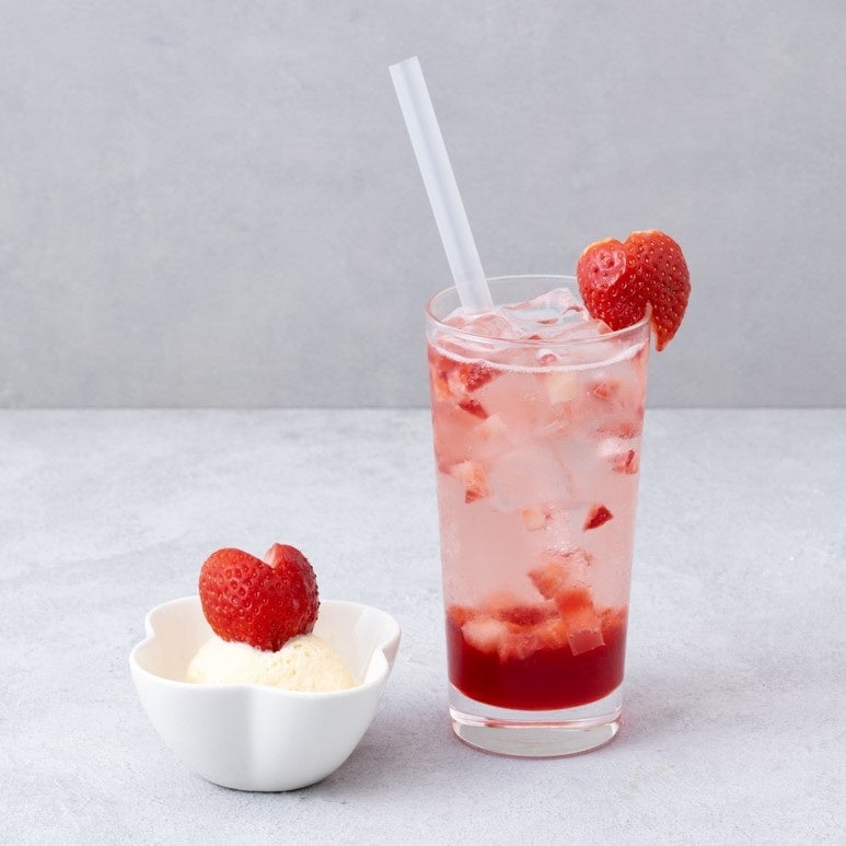 いちごの甘酸っぱさを生かした、のど越し爽やかなドリンク。別添えのバニラアイスには