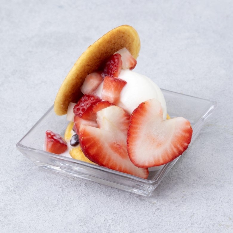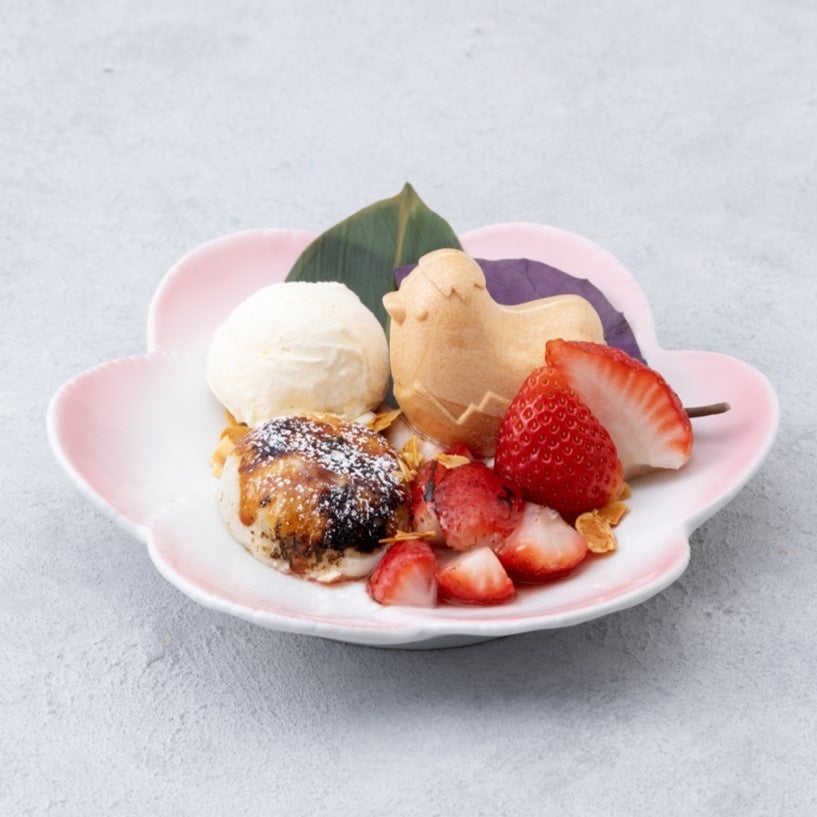 バターで表面をキャラメリゼした大福と、とちあいかとホイップクリームを詰めたヒヨコ型の最中を盛り合わせた愛らしいプレート。いちごと大福を一緒に楽しんだり、アイスを絡めて味わったり、食べ方は自由自在。アイスはバニラか抹茶をお好みで選べ、どちらも甘さとコクが絶妙にマッチ。見た目も可愛らしく、食べる楽しさも広がる一皿です。