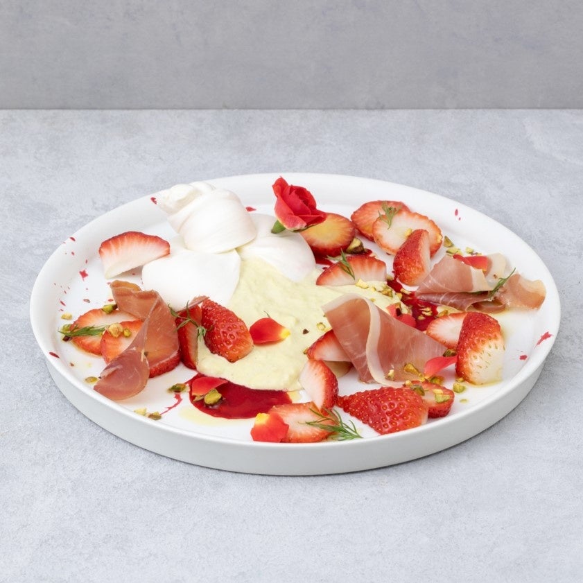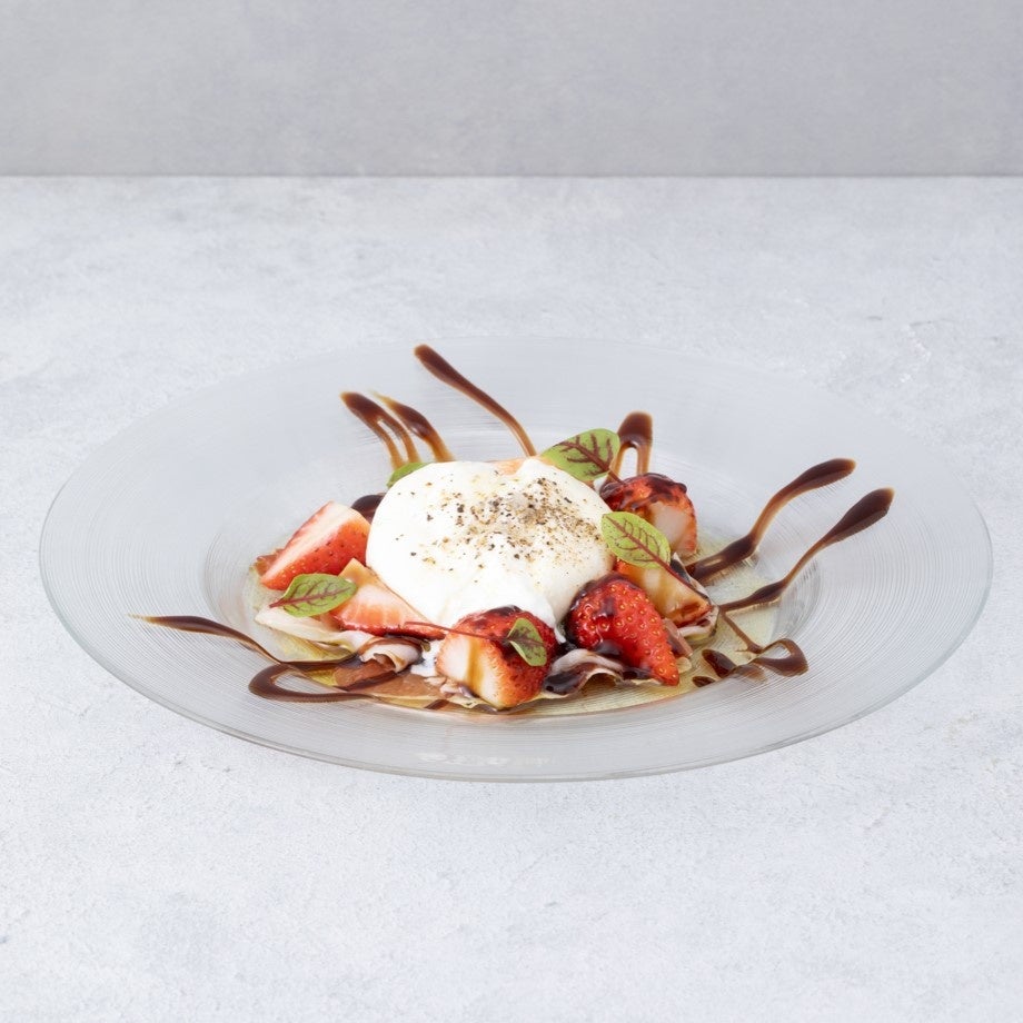 毎朝工房から届けられる出来たてのブッラータチーズととちあいかを使った特別なひと皿。ミルキーで濃厚な味わいが特長のピスタチオペーストを練り込んだブッラータ、12ヶ月熟成のうま味が凝縮された生ハム・ハモンセラーノ、さらに甘酸っぱさが引き立つとちあいか、新鮮な素材と熟成された素材、それぞれが引き立て合う美味しさを堪能できます。