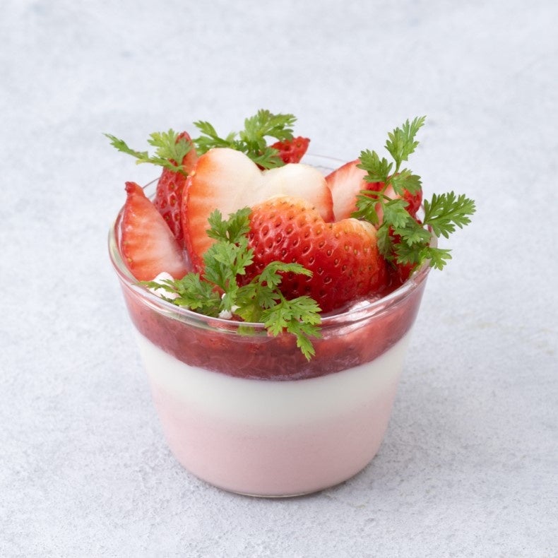 ミルクといちご、2層のパンナコッタの上に、いちごと砂糖のみで作った自家製ソースをのせ、さらにとちあいかを盛りだくさんにトッピング。仕上げとしてかかっているさっぱりとしたカッテージチーズや、フリーズドライいちごの酸味とカリッとした食感がアクセントになっています。