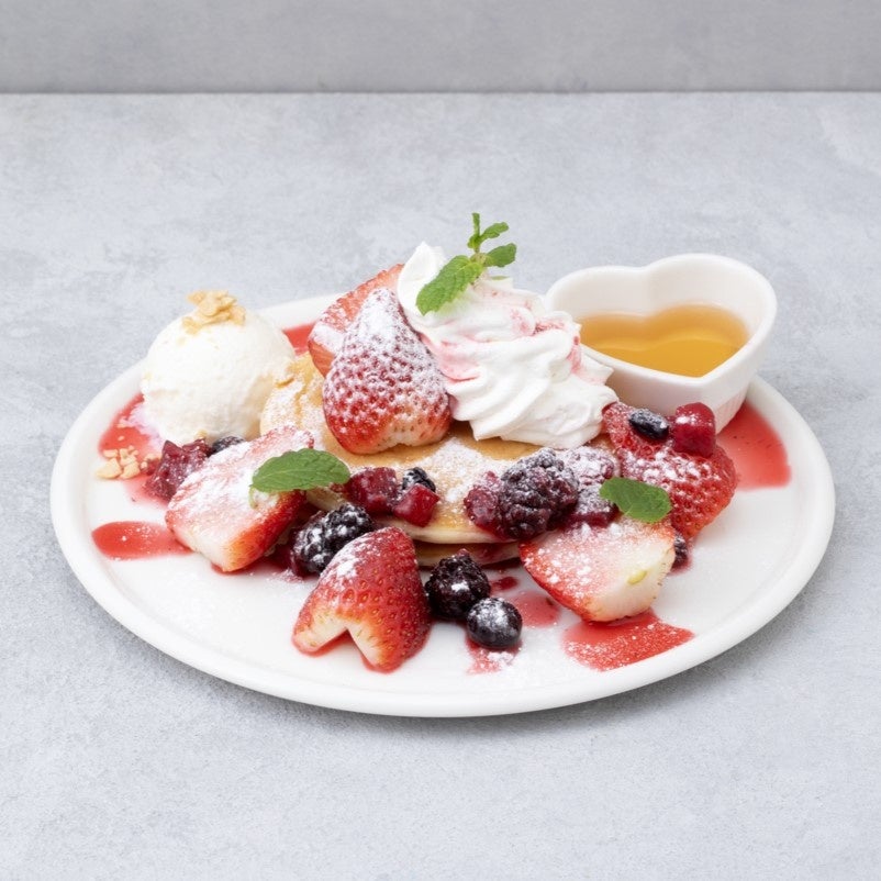 しっとりとしたパンケーキにココナッツアイス、とちあいかやミックスベリーを添えた、見た目も華やかなプレート。ココナッツのトロピカルな香りと、とちあいかの甘みや酸味がクセになる味わいに。お好みで別添えのメープルシロップをかけても美味しくいただけます。