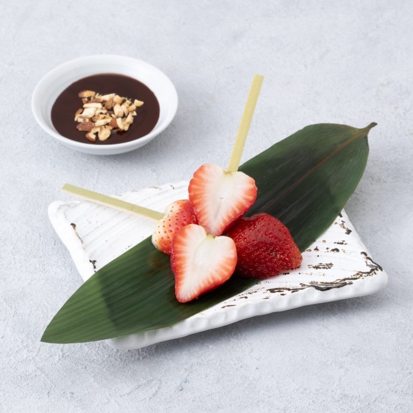 お店初の“フルーツ串”で、カットしたとちあいかの片面だけを軽く炙り、アーモンド入りのチョコレートソースを付けて味わう温かい一品です。ほんのり温めたいちごは甘みが増し、ひと味違った美味しさを堪能できます。