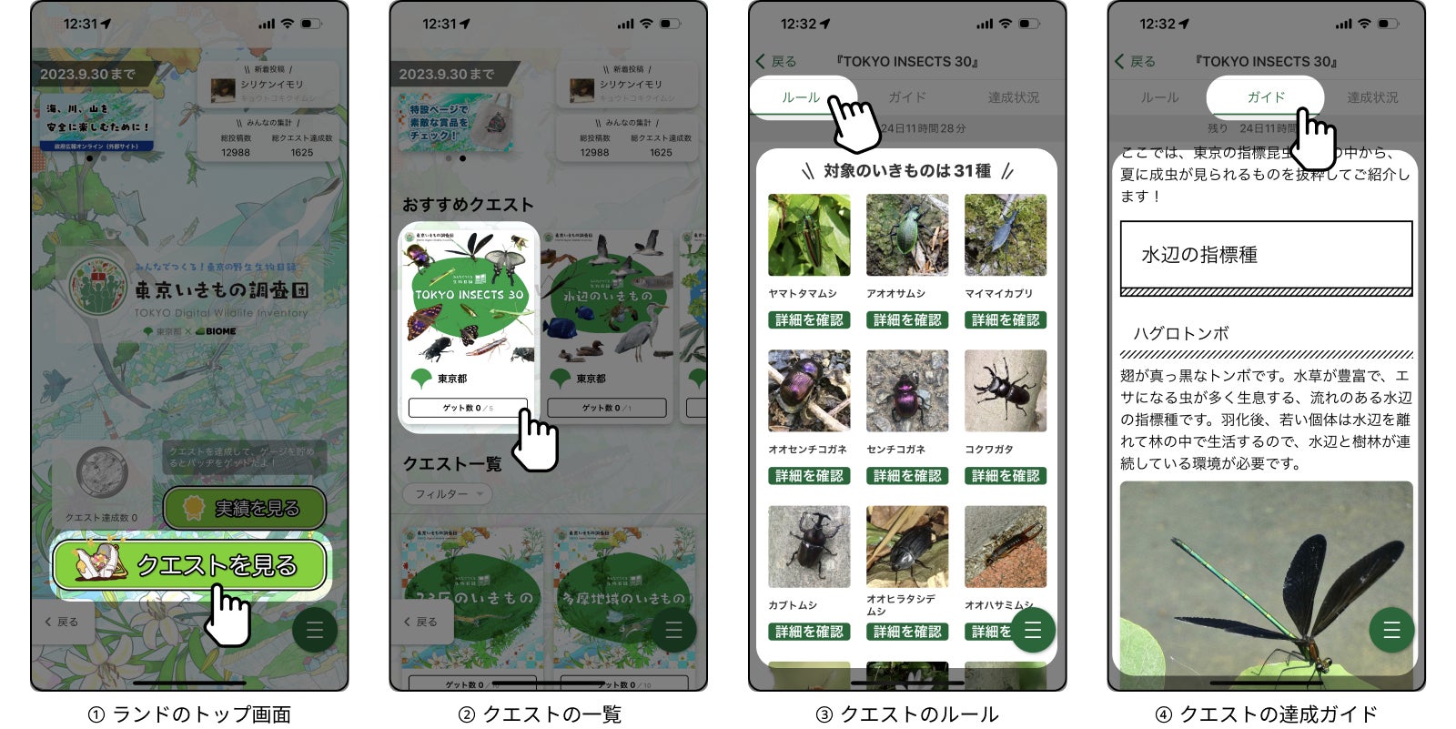 クエストとは、いきもの探しをゲーム感覚で楽しめる機能です。都内で対象のいきものを見つけて投稿することで、クエストが達成できます。達成の条件はクエストごとに様々です。