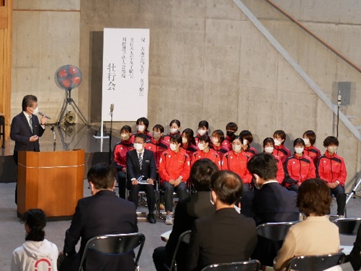 塚本英邦副学長からの挨拶に続き、中瀬洋一監督と主将である古賀華実選手(初等芸術教育学科4年生)から大会意気込みのコメントがありました。