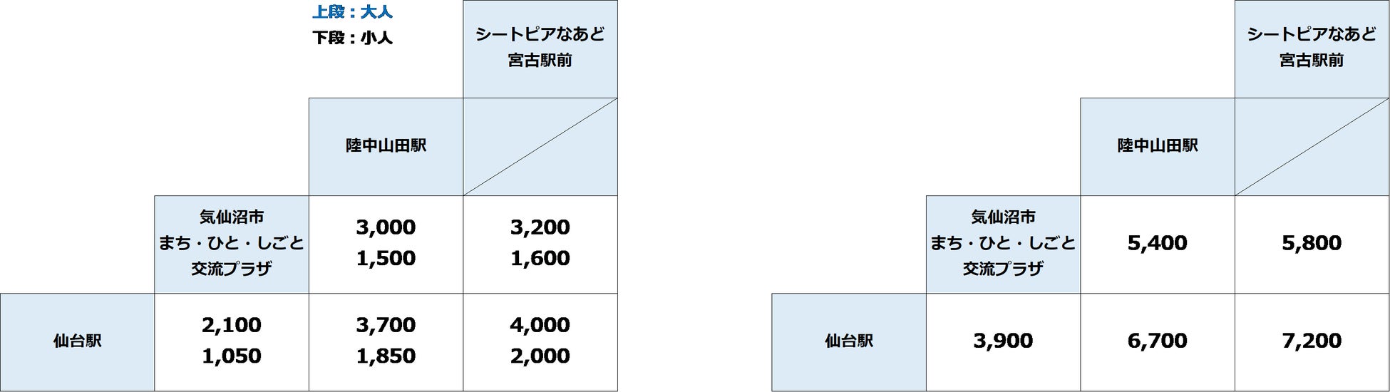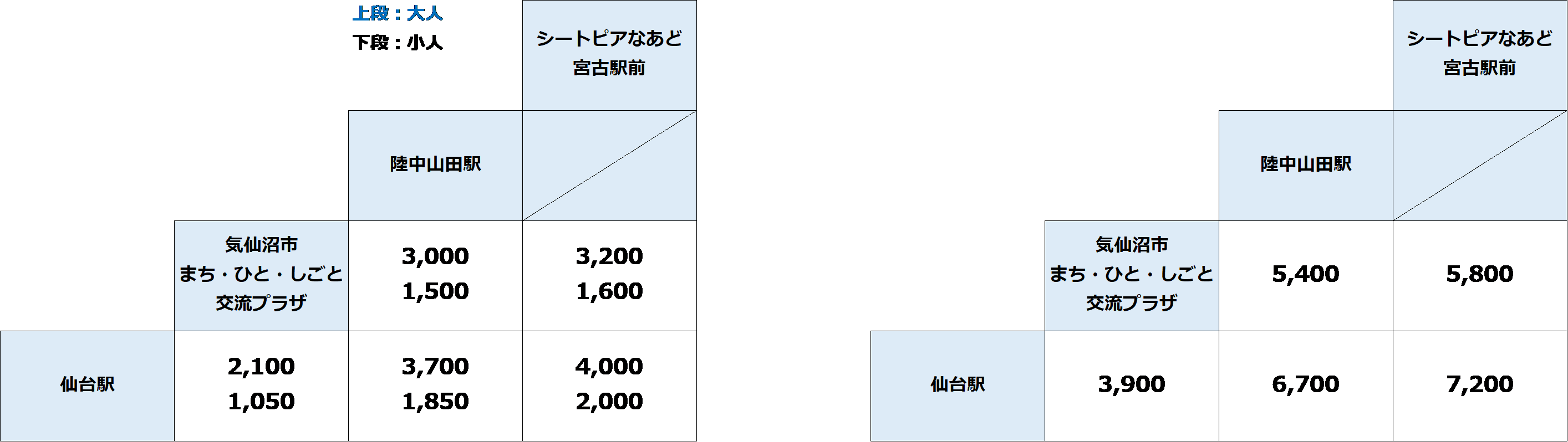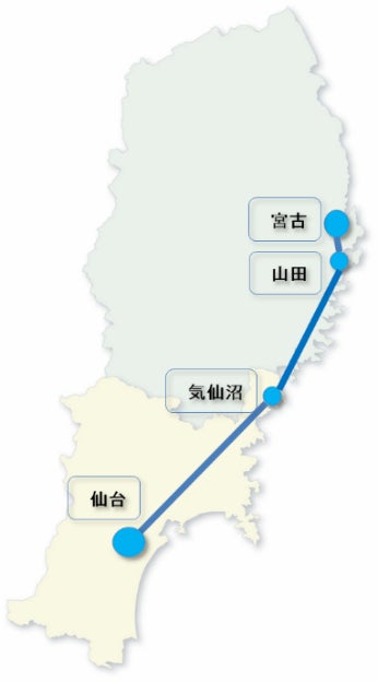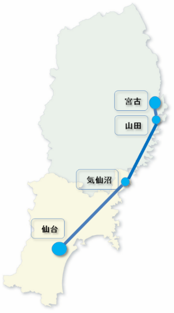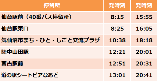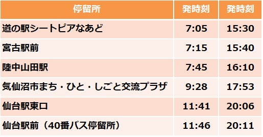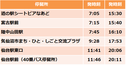 道の駅シートピアなあど(宮古市内) ― 宮古駅前 ― 陸中山田駅前 ― 気仙沼市まち・ひと・しごと交流プラザ ― 仙台駅東口 ― 仙台駅前(40番 宮交高速バスセンター)