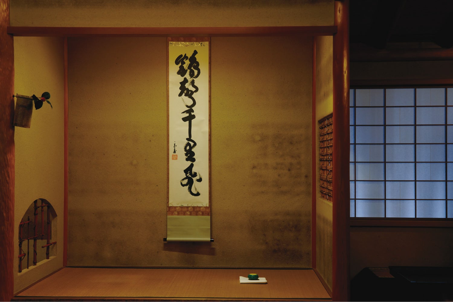 まるでお寿司屋さんのようなカウンター形式のお席で、経験豊富な京菓子職人がお客様の目の前で、生菓子(上生菓子)をおつくりする実演の場。みるみるうちにできあがる季節の生菓子は新鮮で美しく、点てたてのお抹茶とともにお召し上がりいただくと格別のご体験と思い出になることと存じます。