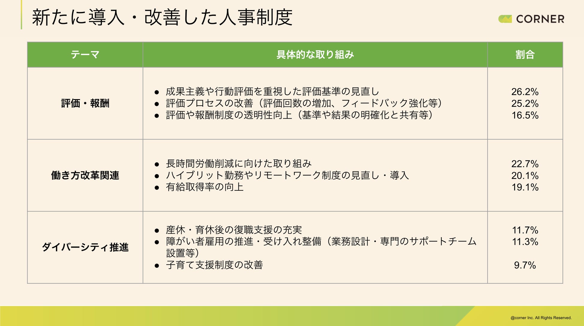 人事プロフェッショナルブティック「CORNER」を運営する株式会社コーナーは、企業の経営・人事部門308名に「組織戦略の振り返り調査」を実施し、人事制度や組織・人材開発のトレンドと施策例を公開しました。組織戦略の成功ポイントが明らかになっております。2025年の人事戦略立案にぜひお役立てください。