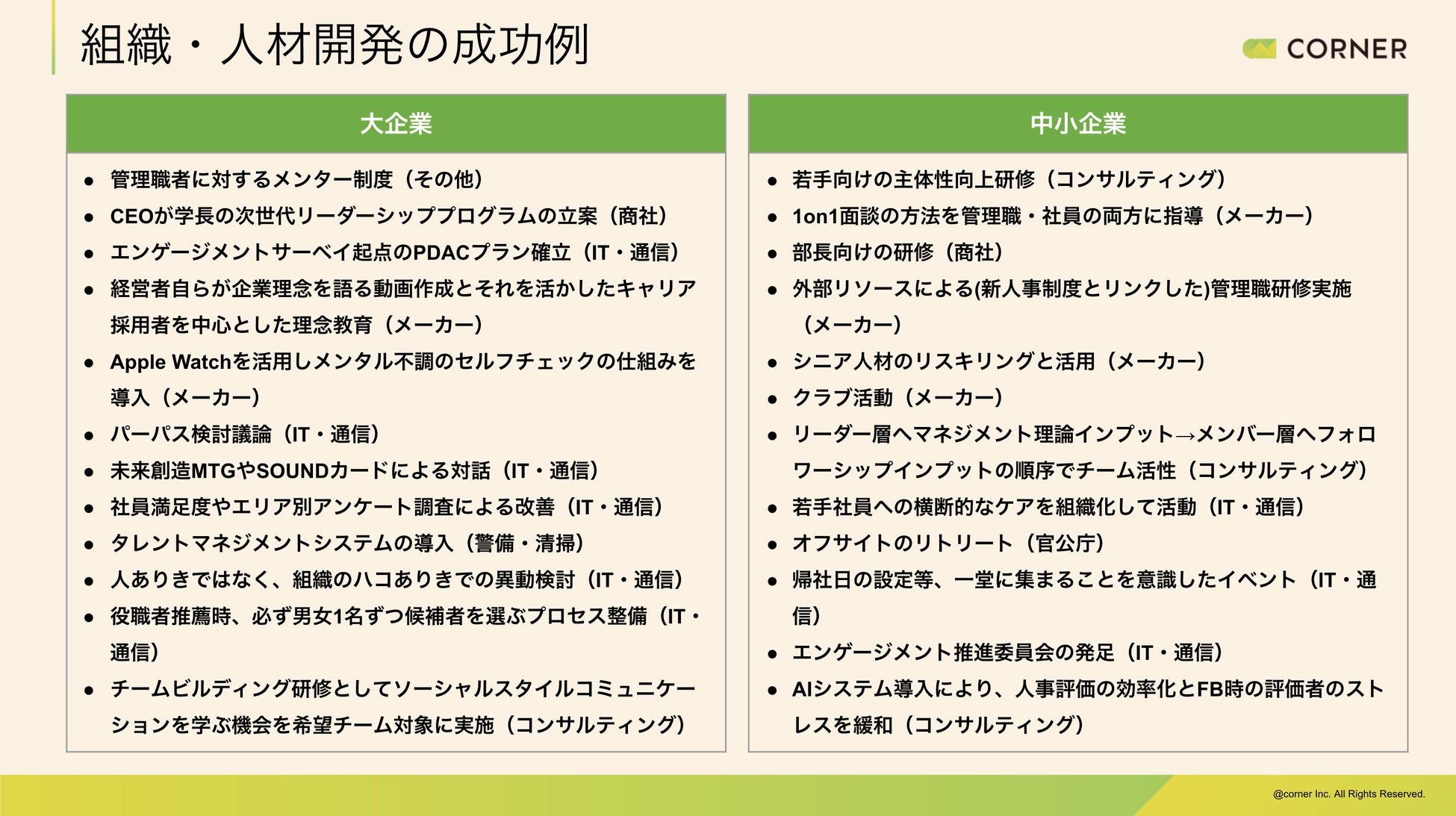 成功例を見ると、大企業ではテクノロジーを活用した効率的かつスケーラブルな取り組みが目立ち、中小企業は人と人との直接的なコミュニケーションを重視したものが多い。