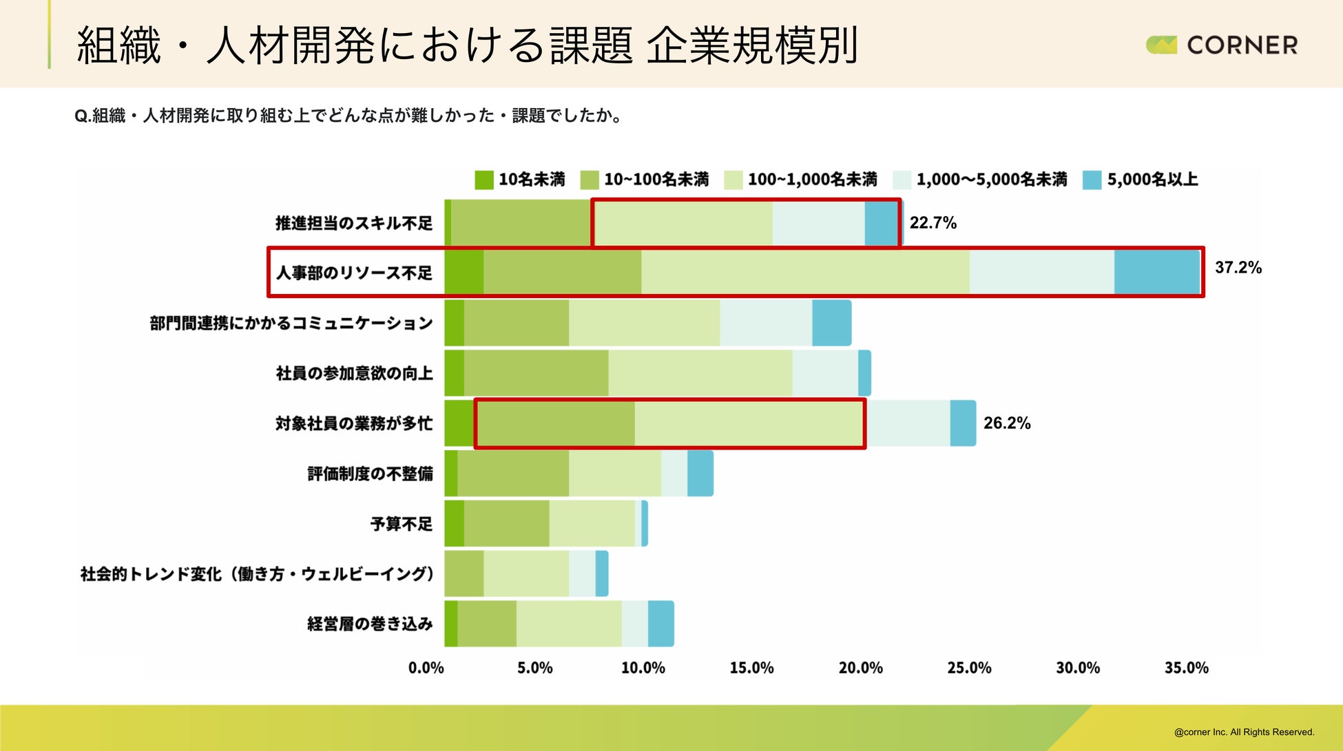 企業規模を問わず「人事部のリソース不足」が課題の1位。特に中小企業では多忙な業務環境が効果的な施策の推進を阻害している可能性がある。企業規模が大きくなるにつれ、「推進担当のスキル不足」への課題感が高まる。研修や専門家のサポートや、経営層を巻き込み、実行力を高めることが求められている。