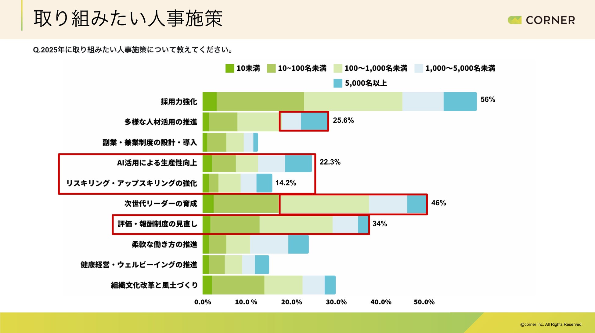 ・2025年に取り組みたい人事施策は、AI活用による生産性向上やリスキリング・アップスキリングの強化。多様な働き方を可能にする施策が中小企業で注目され、大企業では規模拡大に伴う多様性対応が焦点となっている。