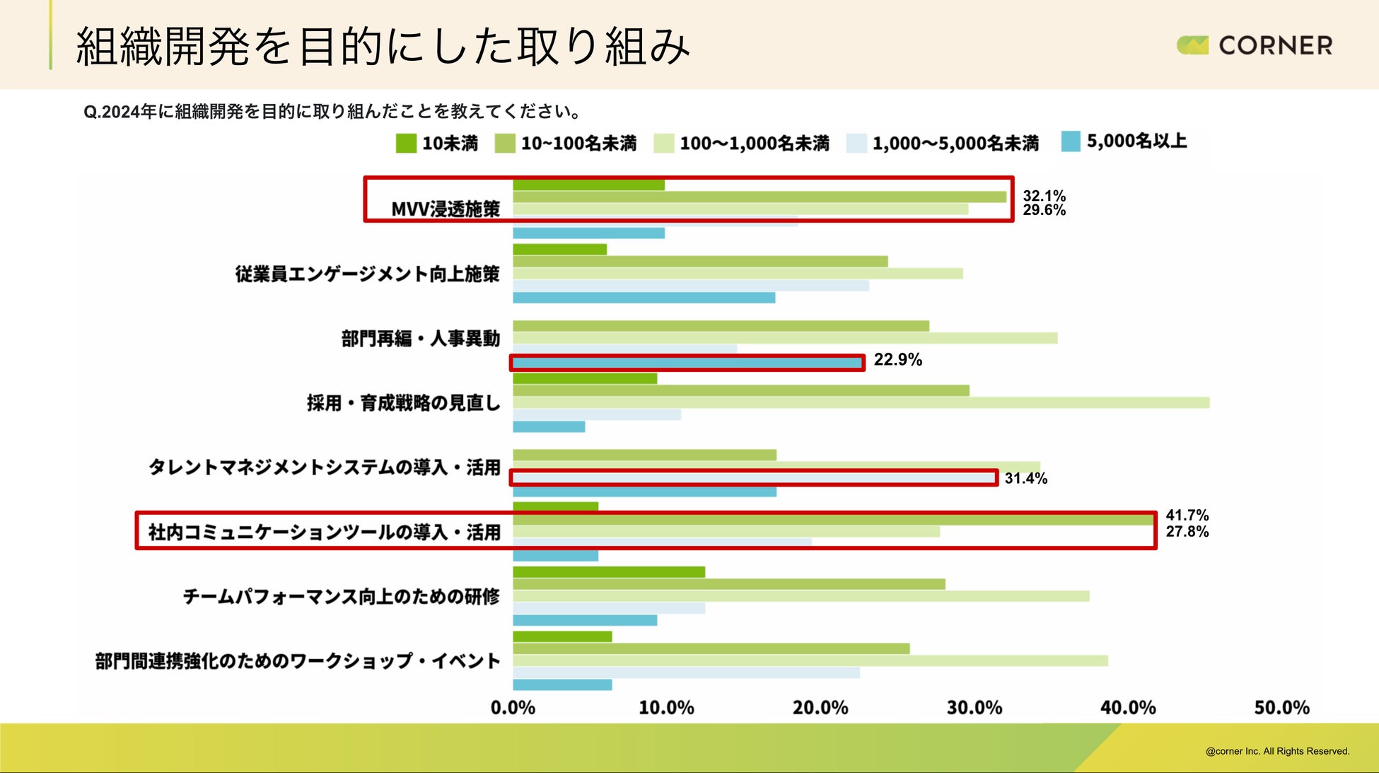 中小企業ではMVV浸透施策や社内コミュニケーション施策など、リソース不足からコスト効率の高い施策が選ばれている。大企業では、複雑な組織構造に対応するシステムや制度整備が課題であることが顕著になっている。