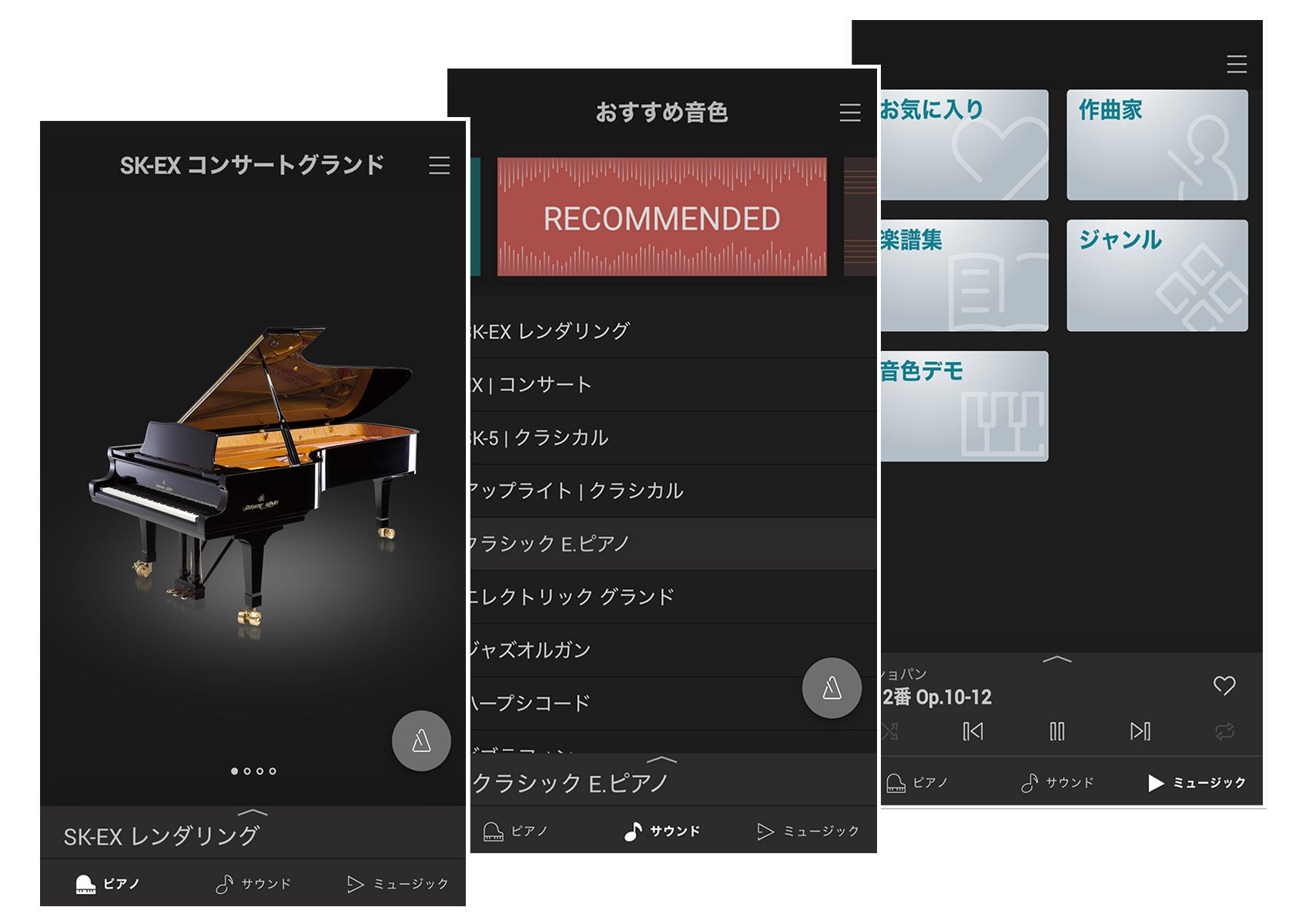 フルコンサートピアノSK-EXをサンプリングした音色「SK-EXコンサートグランド」を搭載しています。SK-EXの繊細で伸びやかなピアニシモから、壮大に響き渡るフォルテシモまで、広大なダイナミックレンジの音色をお楽しみいただけます。