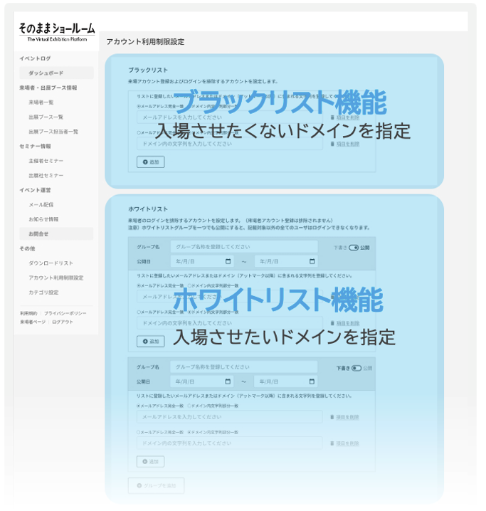 ご要望を多く頂いていた、指定した来場者だけを入場させるホワイトリスト機能、またはライバル企業などの入場を排除するブラックリスト機能を実装しました。