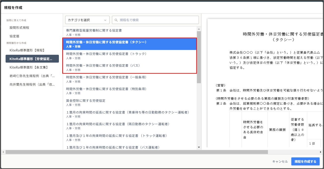 また、運送業においては、36協定届の他に労使協定書の提出が必要となりますが、「KiteRa」ではトラック・バス・タクシー業における労使協定書の書式も提供しているため、さらなる業務効率化が可能となります。
