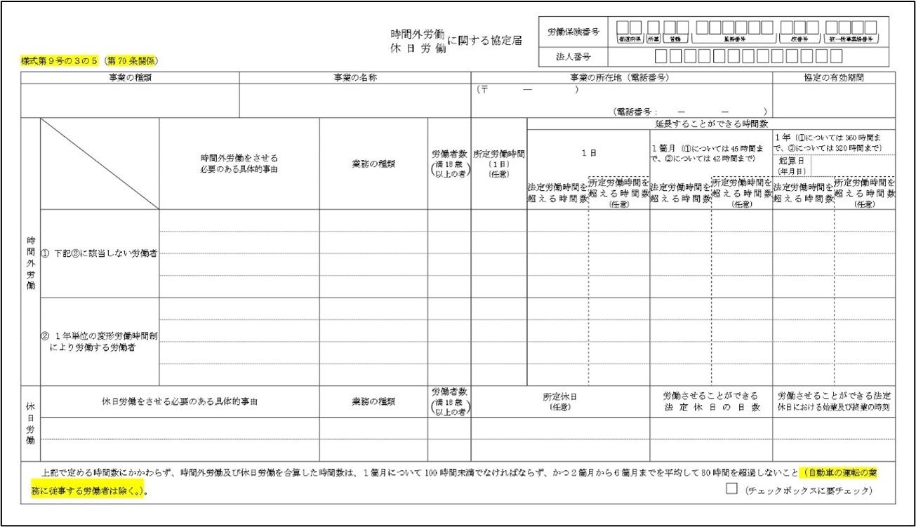 一方で、物流業・建設業・医師など一部の業種ではこの上限規制が免除されていましたが、2024年4月より他の業種と同様に上限規制が適用されます。これに伴い、36協定の届出様式も全ての業種で新様式に変更されます。今後は、36協定の始期が2024年4月1日以降のものはすべて新様式で36協定届を提出する必要があり、現行の様式で提出されたものは受理されません。