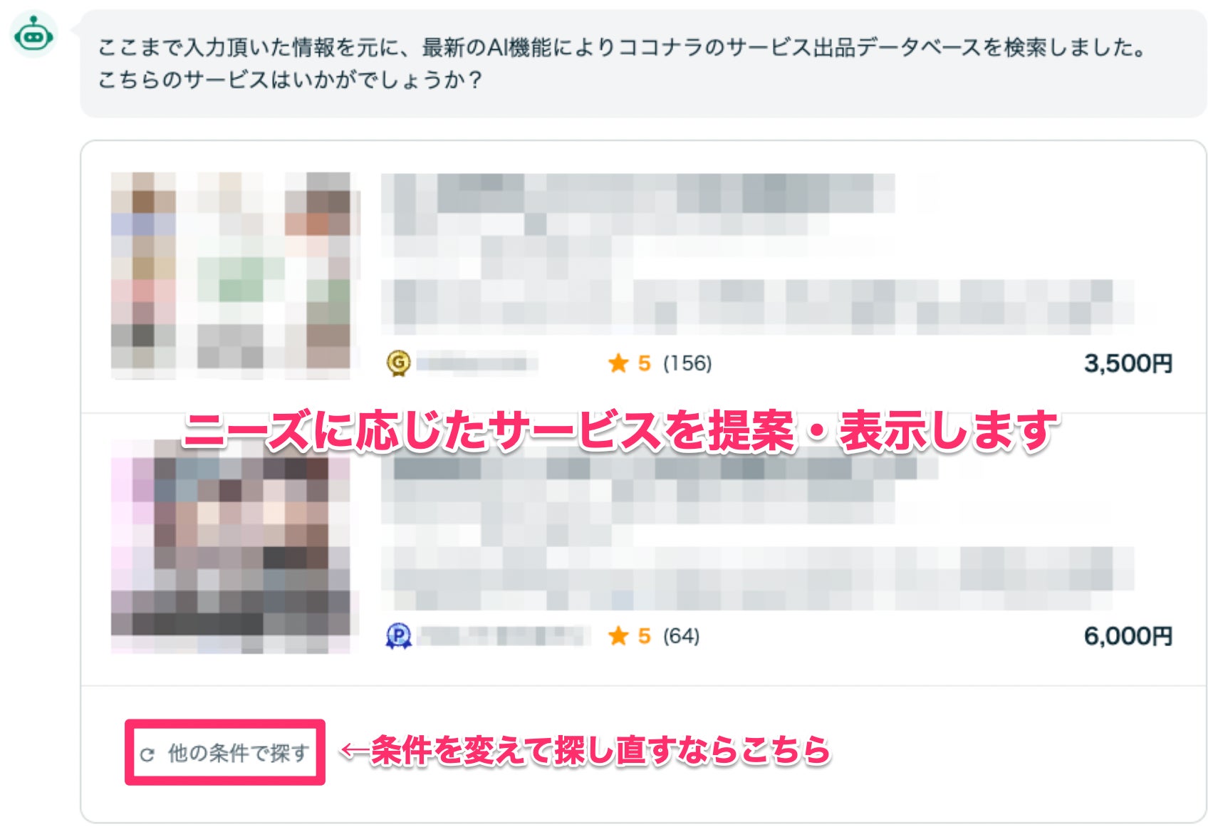 全てのカテゴリを横断し該当するサービスを複数ご提案します。提案されるサービスはココナラの中で十分にサービス項目の記載があり、かつ過去に取引実績があるものとなります。
